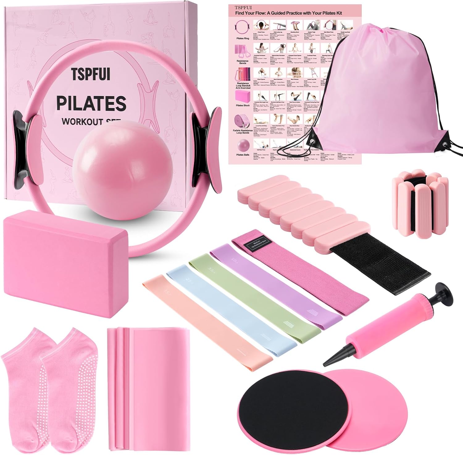 Pilates Kit, Home Pilates Workout Kit for Women, Pilates Equipment with Pilates Ring and Ball, Yoga Block & 5 Resistance Bands, Ankle Weights, Sliders & Grip Socks, Workout Guide Included