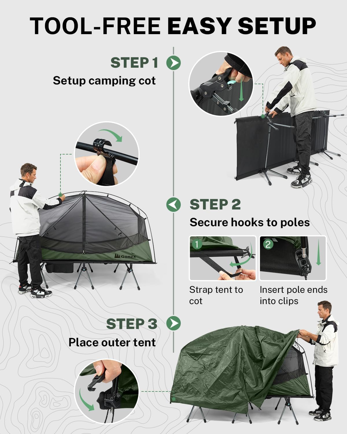 | Included Components | Breathable Inner Tent, Camp Cot, Waterproof Rain Fly |