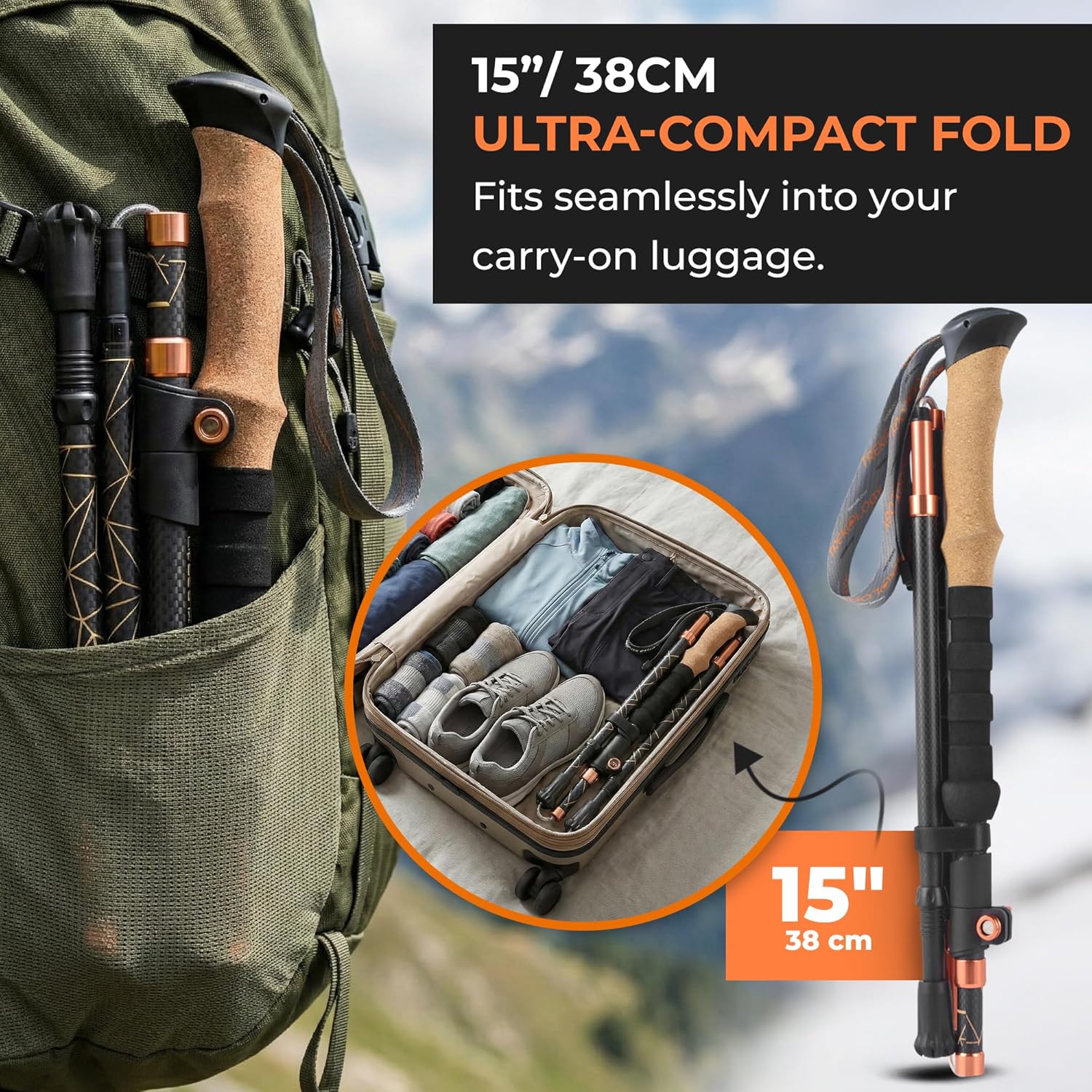 The Trekology TREK-Z PRIMA represents the pinnacle of trail engineering, combining the market’s lightest 100% 3K carbon fiber construction with a high-tensile design that weighs from just 230g—lighter than a smartphone. These premium carbon fiber trekking poles utilize a vibration-dampening shaft to outperform stiff aluminum, while our reinforced joinery ensures unyielding, "no-rattle" stability and a rigid, heavy-duty feel for reliable balance on technical terrain. Designed for the global adventurer, this tri-fold collapsible trekking pole packs down to a compact 15 inches (38cm), making it the ultimate folding walking stick for carry-ons and daypacks. With a rapid, 10-second setup featuring a metal Flip-Lock system, these hiking poles for women and men offer precision adjustable lengths (100-120cm or 115-135cm) for a custom ergonomic fit. Each set is finished with moisture-wicking natural cork grips and includes a complete 4-season accessory kit with mud and snow baskets, providing a professional-grade, ultralight solution for every hiking adventure.