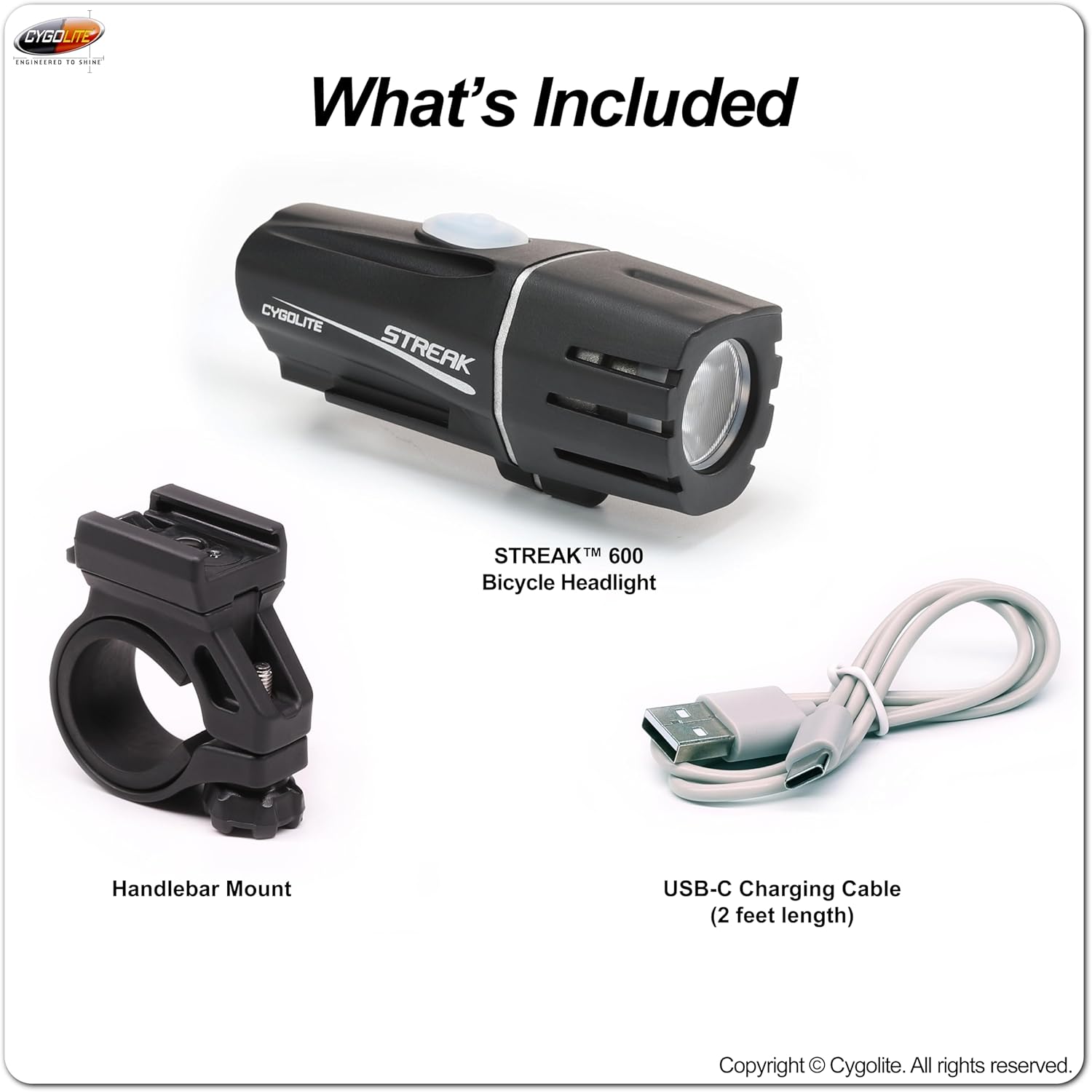 | Included Components | Bicycle headlight, Handlebar mount, USB-C charging cable |