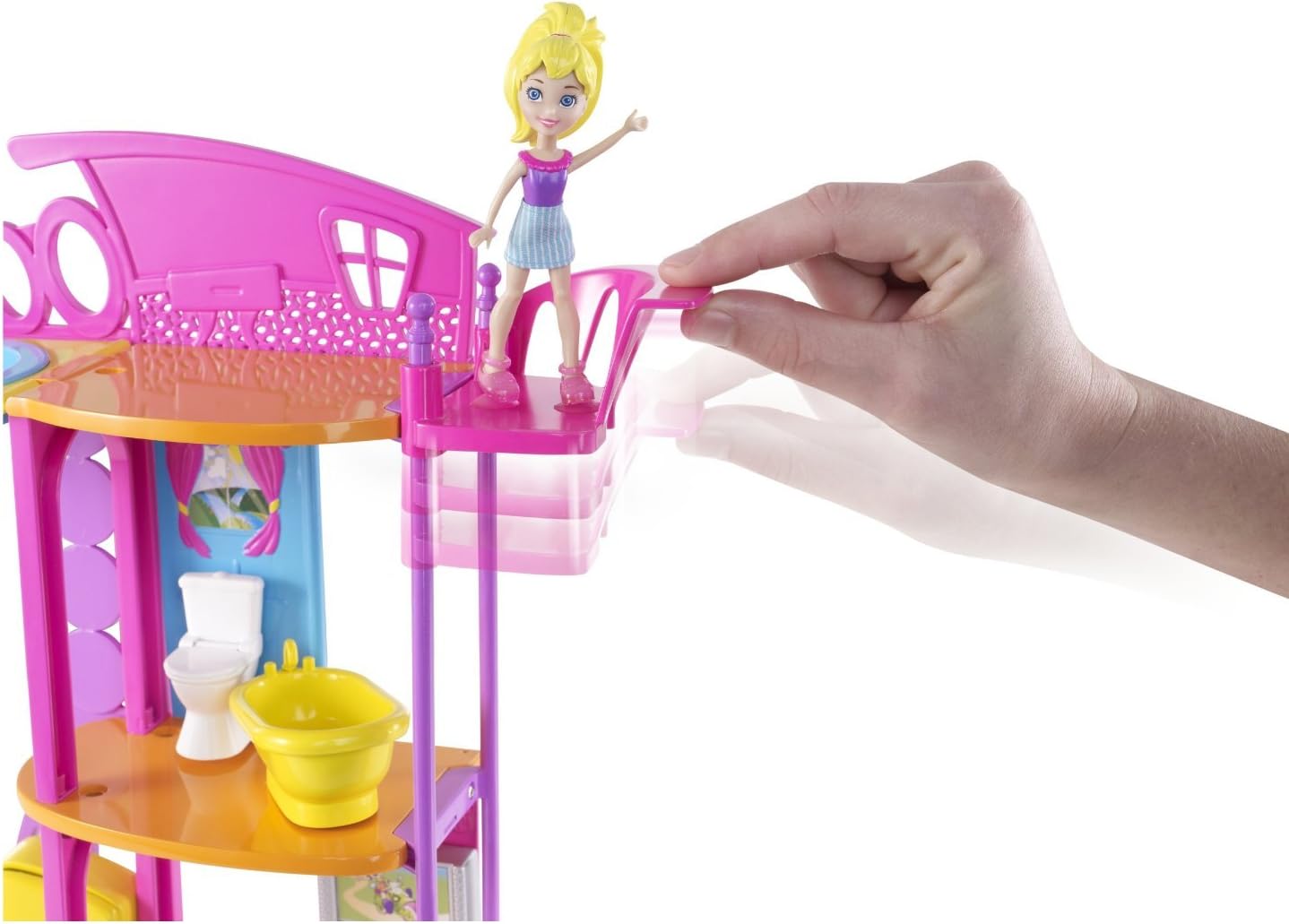 From the Manufacturer Polly Pocket Hangout House Playset: Why go out when it can be just as much fun to hang out at home? Polly doll's house delivers a guaranteed adventure with addicting Stick 'n' Play set-up play. Every piece in this play set incorporates a suction cup to allow for true ease of play. The furniture can be rearranged in funny new ways, to really turn things upside down. This house is filled with secrets and surprises, like transforming walls that reveal day-to-night transformation or different room settings. Take the pink elevator to the third floor that transforms from a bedroom to a rooftop pool. All of Polly doll's friends will want to stick around. Includes Doll House playset, 1 Polly doll, pet dog and house-play accessories. Additional Polly Pocket Dolls sold separately.