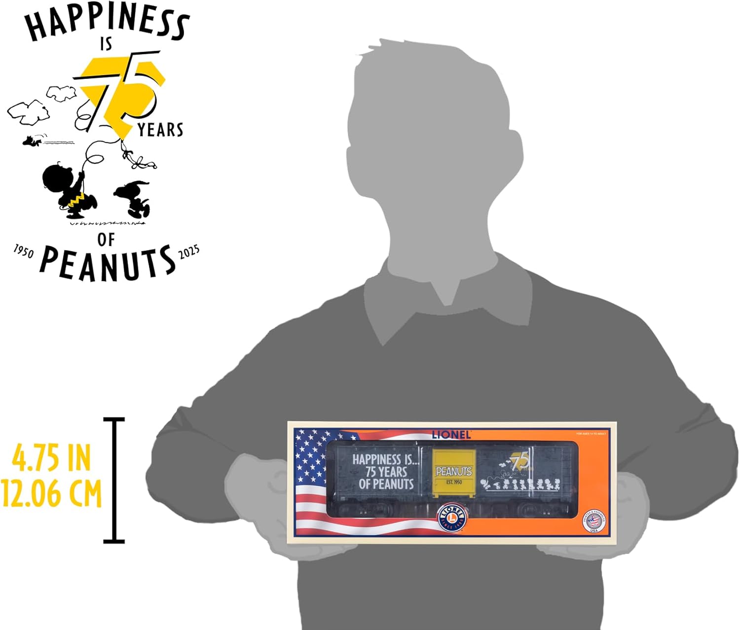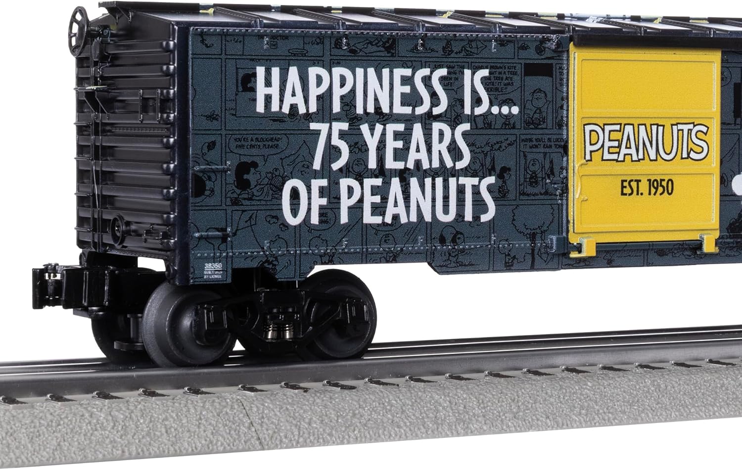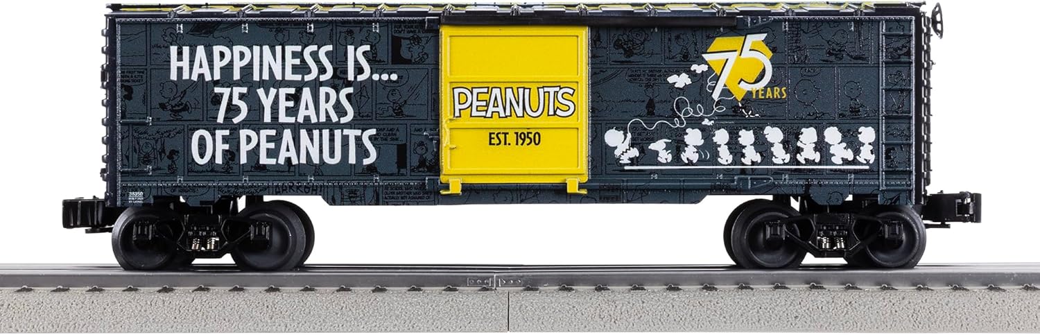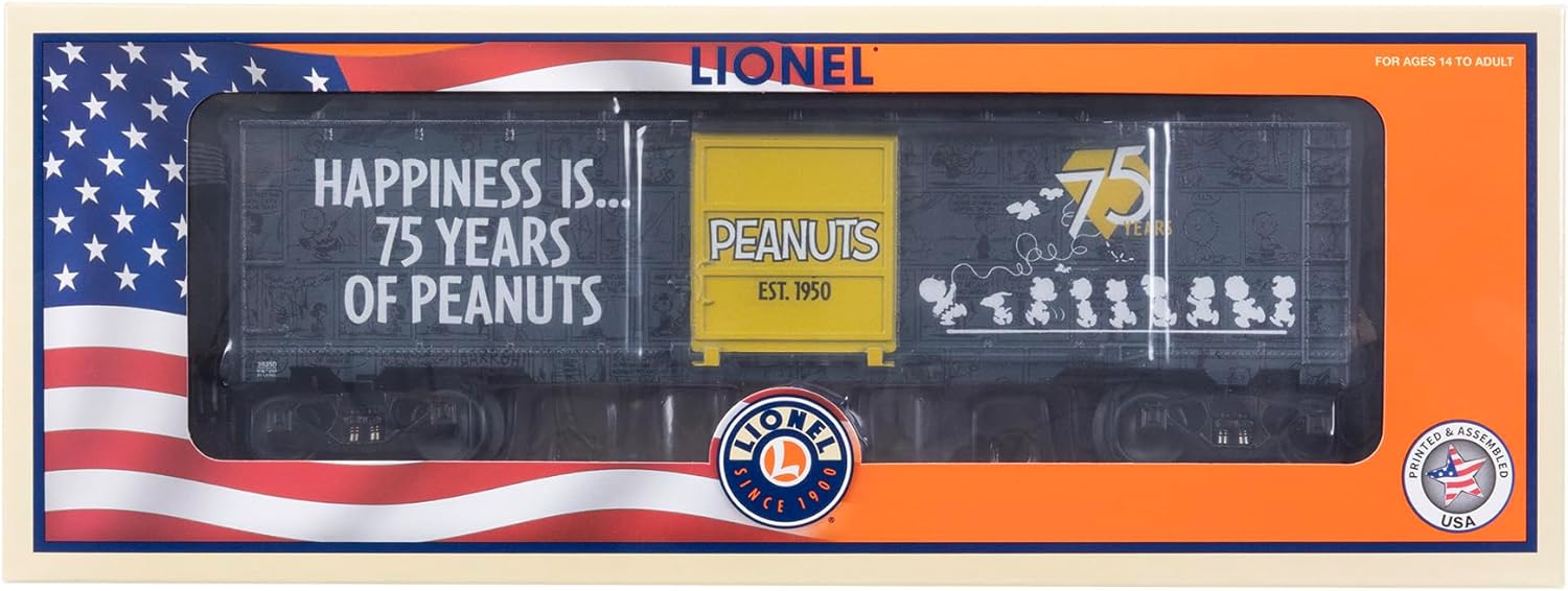 Lionel Peanuts 75th Anniversary MUSA O Gauge Model Train Boxcar celebrates 75 years of Peanuts classic scenes, and characters that bring joy and nostalgia of the beloved comic strip into your home. Boxcar is compatible with Lionel O Gauge, printed and assembled in the US, and includes roof print deco. Car features die-cast metal trucks, operating couplers, and opening side doors. Recommended for ages 14 years and up