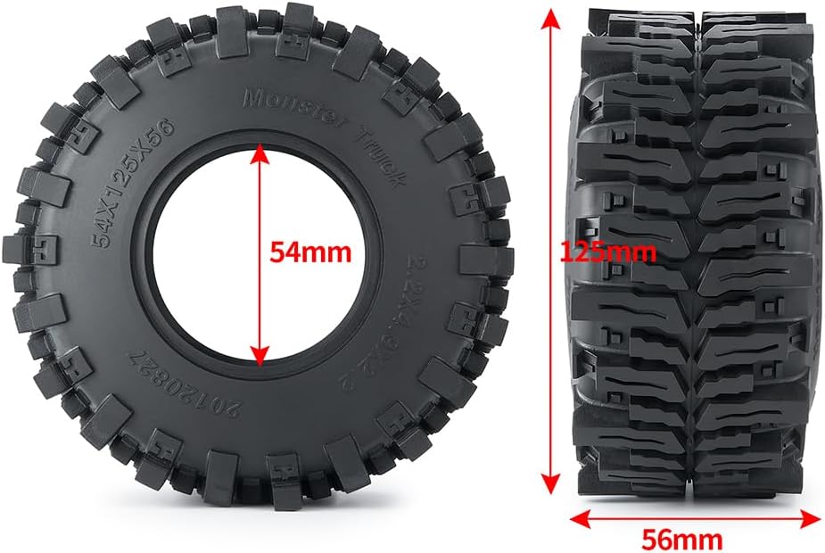 Item name:QUPA AM STORE RC Rubber 2.2 Crawler Tires 125MM 4PCS for 1/10 Scale SCX10 AXI03004 RC Crawler Car AccessoriesOuter Diameter: 125mm, Inner Diameter: 54mm, Width: 56mm.