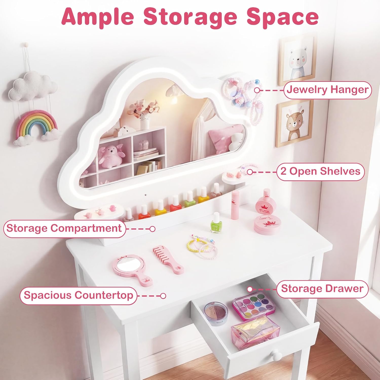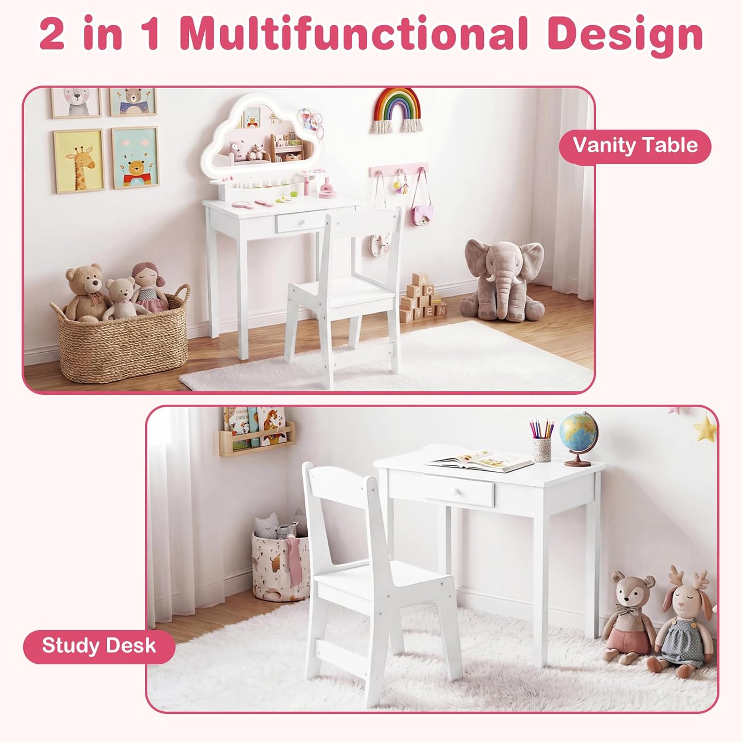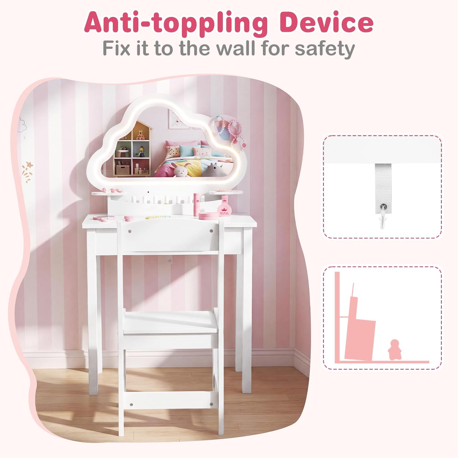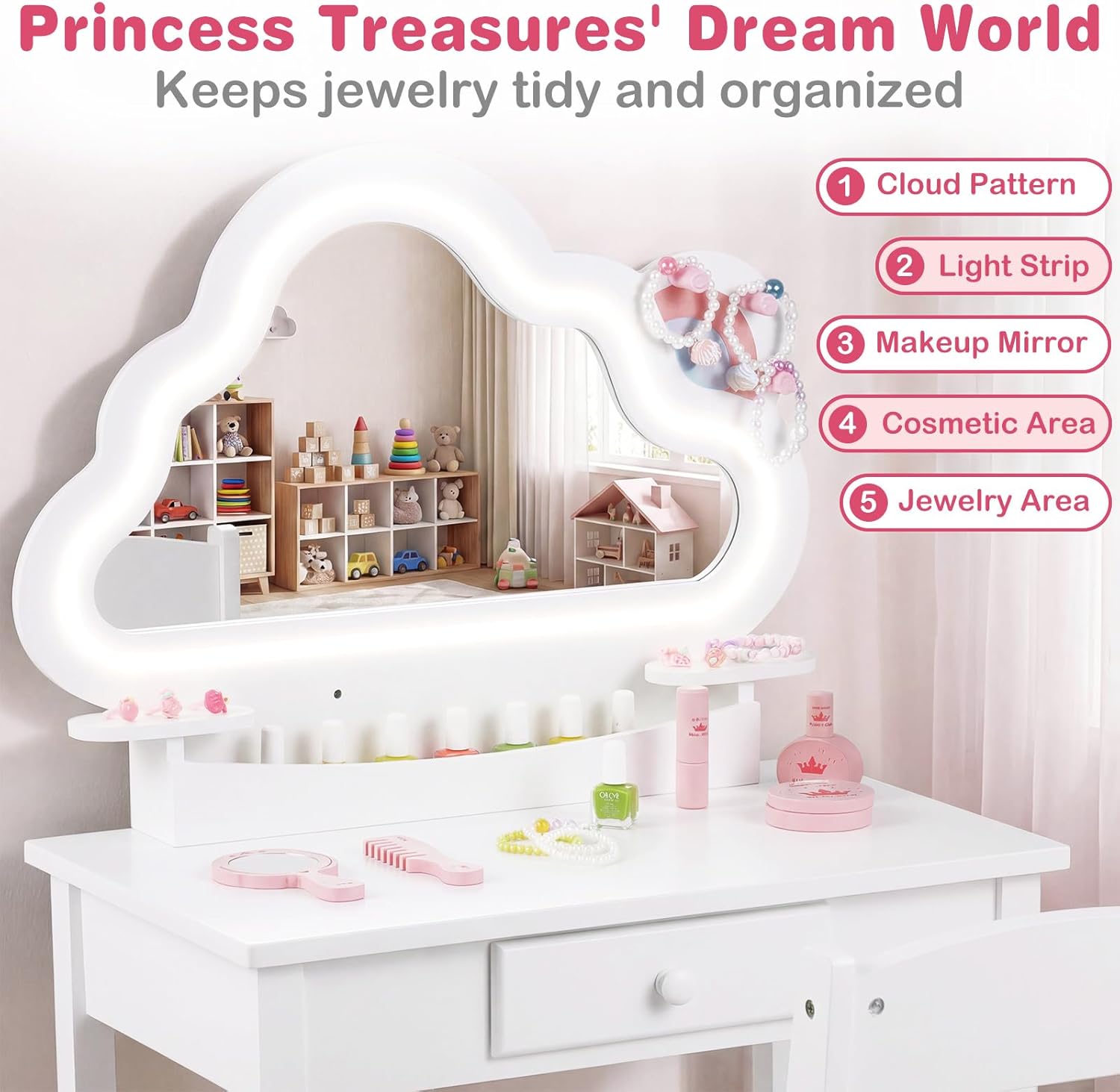 Create a dreamy vanity nook just for little princess with OLAKIDS kids vanity table and chair set—an absolute delight that’s sure to capture every girl’s heart! Press the switch to effortlessly toggle between cool and warm lights (requiring 3 AA batteries, not included), enhancing the fun and charm of dressing-up sessions. 3 compact jewelry hooks keep all tiny treasures neatly hung and within easy reach. Boasting ample storage space, it also encourages child to develop great organizational habits. Safety is fully guaranteed from every angle, so child can play and primp with complete peace of mind. Adorned with an adorable cloud-shaped design and coming with a 5-piece wooden toy set, the little girl vanity set with chair and mirror unlocks more playful possibilities. Table dimension: 23.23’’ x 13.78’’ x 40.75’’; chair dimension: 12.60’’ x 13.78’’ x 25.59’’. Perfect as a birthday gift for girls aged 3 to 6 or as a cute decoration for the kids’ room, this girl vanity set with mirror and lights shines bright in any space and lets child indulge in her own fancy dressing-up moments to the fullest!