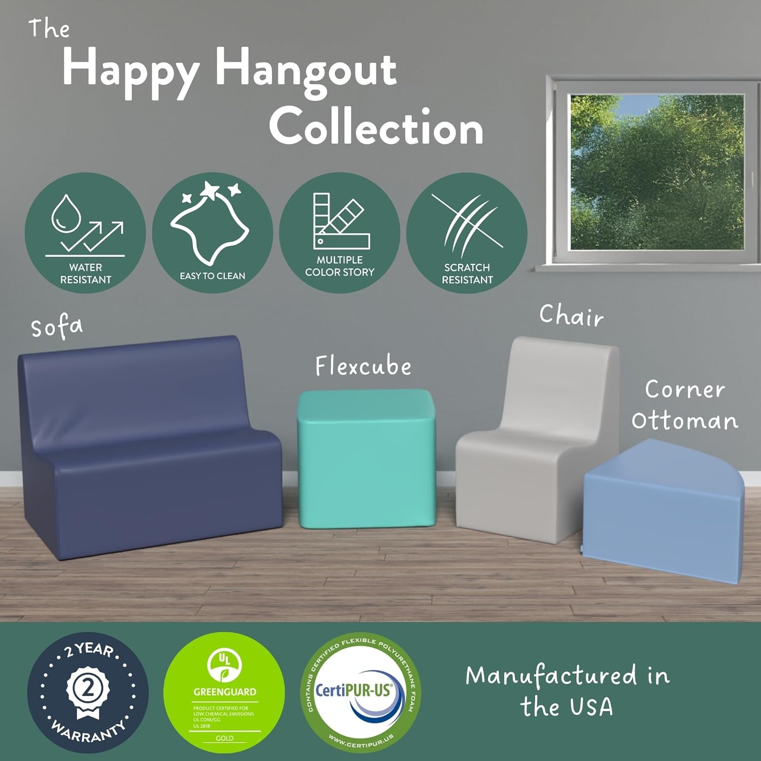 The Children's Factory Medium Contour Sofa is a stylish and functional kids couch designed for comfort and group activities. Made with high-density foam, it provides firm yet cozy support without a traditional wood frame, making it a great toddler couch for reading nooks, play areas, and classrooms. Covered in polyurethane vegan leather, this kids sofa is water-resistant and easy to clean with a simple wipe. Lightweight and versatile, this modular kids play couch is easy to move and rearrange. Built with CertiPUR-US Certified Foam and Greenguard Gold Certified, it ensures a safe indoor environment. Measuring 24” x 18” x 20”, this kids play couch is backed by a 2-year warranty for long-lasting durability.