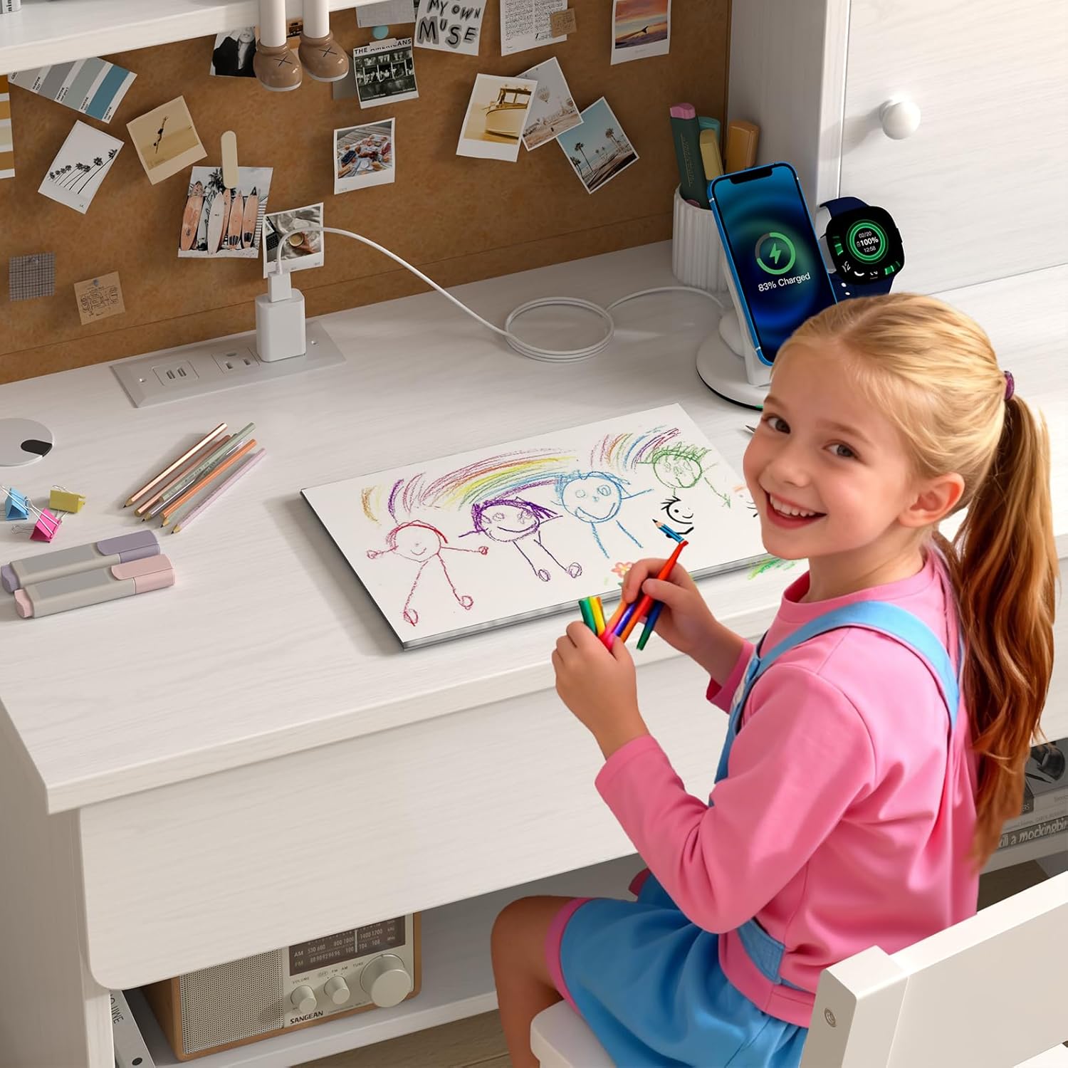 Our Kids Study Desk and Chair Set with Hutch and Drawers offers a perfect place for working on art projects or finishing up their homework. The multiple storage options also help keep bedrooms tidy and organized, which mom and dad are sure to love. Features include. The Kids Study Table with Chair gives young students a perfect space for finishing homework, studying, or working on craft projects. This kid's desk and chair set comes with a clipboard, cabinets, with Drawers & Hutch for Easy Access Storage, The desk offers you ample space to keep books, documents, and other things, suitable for adults and children.CLASSIFIED STORAGE: The large desktop is suitable for putting books or a laptop while the hutch and the open drawers provide extra storage space to keep all learning supplies in order and create a neat and personal studying environment by placingPremium Wood Design: Made of MDF with great durability for a long time Use drawers featuring additional options for putting books, papers,etc-Large and smooth tabletop that can hold plenty of things and is convenient to cleans-Compact design which saves a lot of space and ideal for small places-Easy to assembleMaterial: MDF.Weight Bearing of Desk: 176 lbs.Weight Bearing of Chair: 220 lbs.Package includes:1X Desk 1X Chair, performing the exercises. It provides great stability and durability.