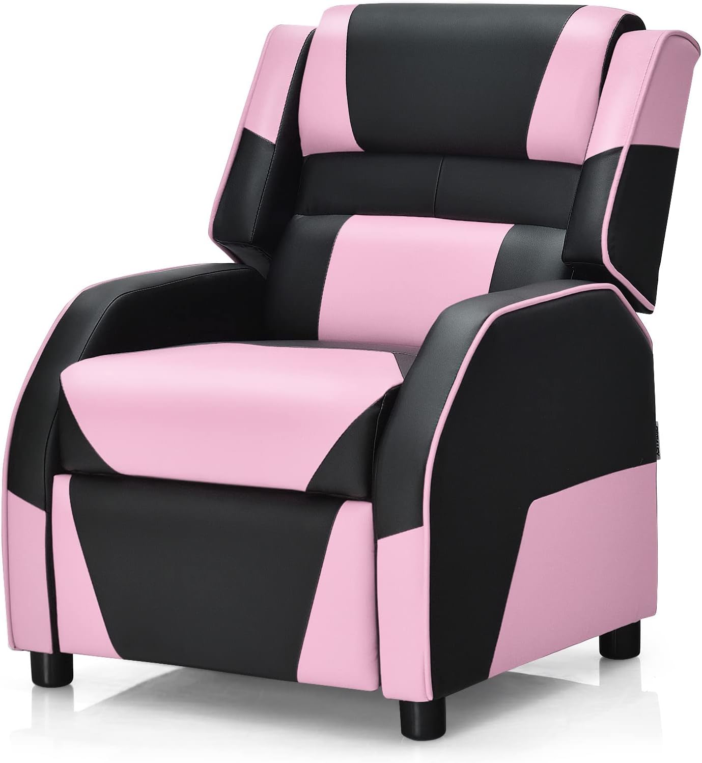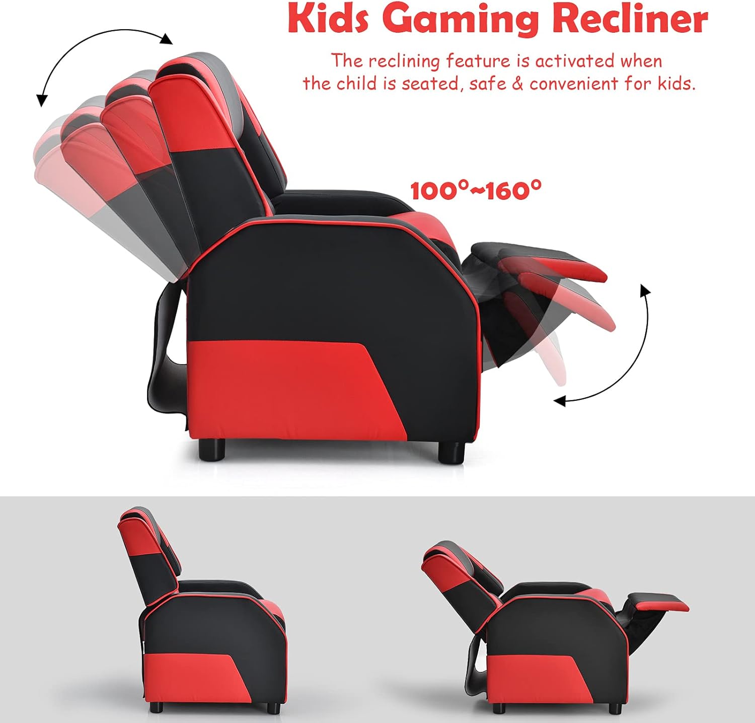 Description:Are you looking for a comfortable sofa for your kid? Our kid recliner will provide a cozy and comfy space for your little one to read stories, relax or sleeping!Constructed from solid wood base, this kid sofa offers strong stability and durability with a capacity of 165lbs for years to use. Meanwhile, the thick padded cushioning provide superior comfort, along with a pillow and soft armrest for added relaxation. Moreover, designed with safety in mind, it reclines only when a child is seated and the footrest is pulled out. The stylish look makes it is sure to be a ideal decoration for bedroom, living room, play room, etc.Don’t hesitate to purchase one as a gift to your little one!Features:Sturdy wood legs and iron frame ensures stability and durability100-160 degree tilting backrest meets different needs of sitting or lyingFilled with high-density sponge, offering great sitting experienceWear-resistant PU leather surface for comfortable feel and easy cleaningThe supportive pillow and back cushion for added comfortSuitable for kid’s bedroom, living room, baby room and play roomA perfect birthday gift or festival gift for your kids’ entertainment and leisureSpecifications:Material: Wood, PU Leather, SpongeProduct Dimension: 24” x 27.5” x 32” (L x W x H)Over Size(Fully Extended): 43.5” x 24” x 27” (L x W x H)Net Weight: 33 lbsWeight Capacity: 165 lbsSuitable for Ages: 3-12 years oldPackage includes:1 x Kids Recliner1 x User Guide