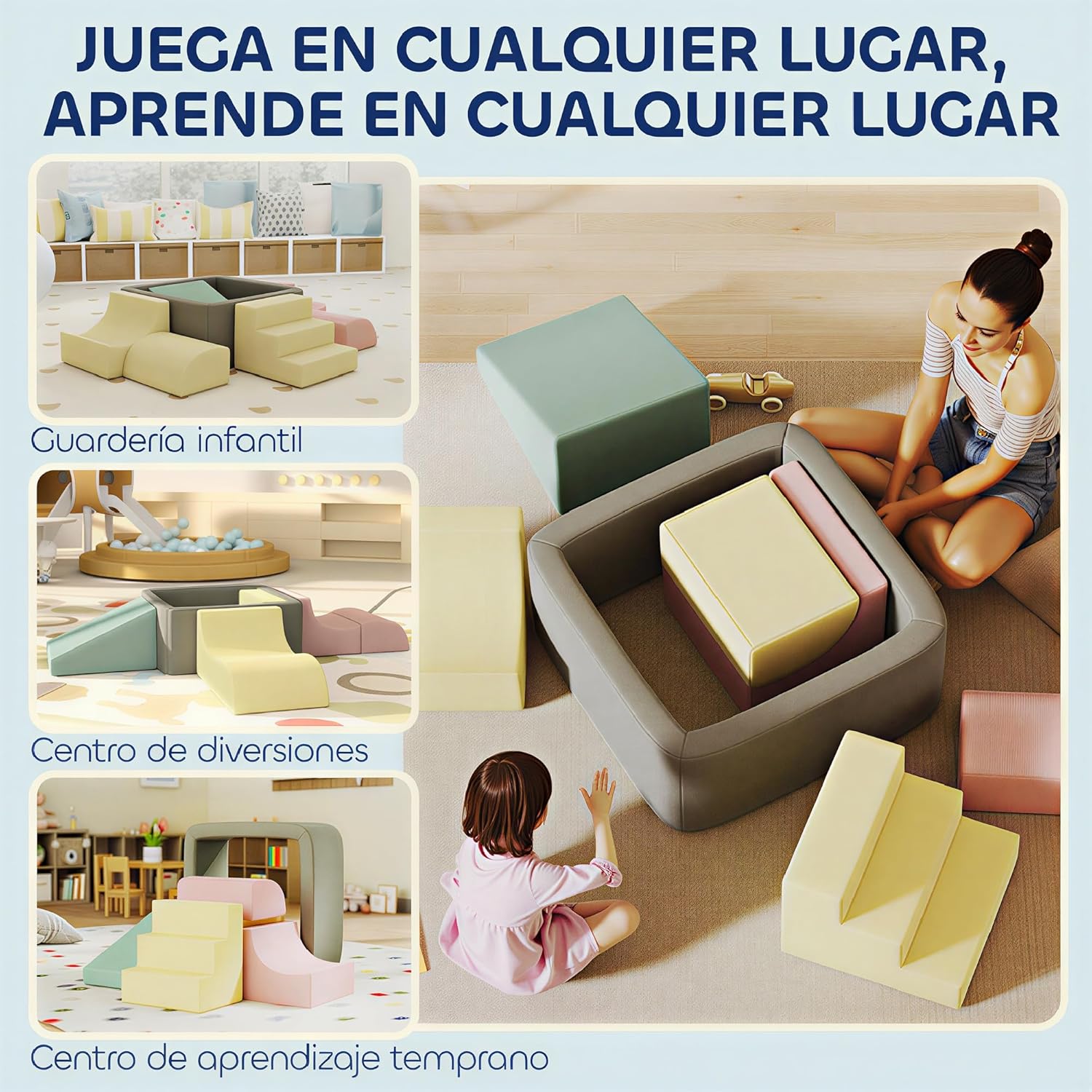 Worried about your child spending too much screen time? Transform their day with these AIYAPLAY foam blocks: designed to build castles, ramps or obstacle circuits, its 28D foam, rounded edges and washable covers turn any corner into a Montessori zone of safe learning and endless fun. Features: ● This AIYAPLAY foam block set includes seven pieces, ideal for encouraging children's creative play ● High-density foam blocks with rounded corners offer safety and comfort ● Foam blocks stimulate gross motor skills and coordination following the Montessori method ● Removable and washable covers make cleaning easy and keep the block set hygienic ● This children's psychomotor set requires no assembly, use the foam blocks after recovering their shape. ● Important Note: We do not ship to the Canary Islands, Ceuta and Melilla, or to the Azores and other islands of Portugal Specifications: ● Color: multicolor ● Material: corduroy velvet, 28D foam ● Total dimensions: 174 x 174 x 30 cm (LxWxH). ● Square block measures: 72.5 x 74 x 30 cm (LxWxH). ● Trapezoid block measurements: 50 x 40 x 30 cm (LxWxH) ● Step block measures: 50 x 40 x 30 cm (LxWxH). ● Dimensions of the triangular block: 35 x 40 x 30 cm (LxWxH). ● Block measurements: 40 x 28 x 16.5 cm (LxWxH) (quarter circle) ● Approved age: from 3 years old ● Recommended Age: 3-6 Years ● Complies with the standard: EN71-1-2-3 ● Maximum load: 45 kg ● Suitable height: ≤120cm ● Reference: 3D0-039V00MX - 1 x Modular Foam Block Set (7 pieces) - 1 x instruction manual (English language not guaranteed).
