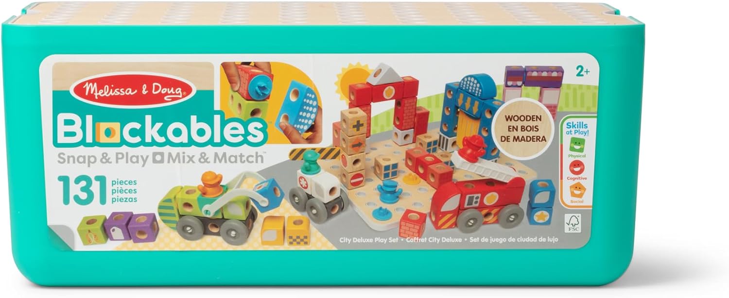 Melissa & Doug Blockables™ are connectable, stackable, and playable! The solid wood connect-and-play building blocks are perfect manipulatives to help preschoolers two and older boost developmental skills (fine motor, problem-solving, matching, storytelling, and self-esteem), while using their imaginations and having fun. Easy-to-grasp smooth, colorful wooden blocks fit together in a snap with large connectors that even little hands can push in and pull out. An illustrated guide shows how to arrange and link the Blockables™ to create multi-textured buildings and vehicles (car wash, drive-through, fire engine and station, traffic gate, recycling truck, taxi, police car, ambulance), or kids can use their imaginations to mix, match, and combine pieces to make unique figures and play their own way! Kids can easily expand their collection -- the 131-piece deluxe play set is compatible with all other Blockables™ play sets. Pieces attach to the removable wooden lid that doubles as a play surface, and store in the durable plastic bin for easy cleanup. Patent pending. This product is certified by the Forest Stewardship Council. FSC certification ensures that products come from responsibly managed forests that provide environmental, social, and economic benefits, and that forests are protected for future generations. Please note that FSC certification applies to new inventory only (FSC C156584)
