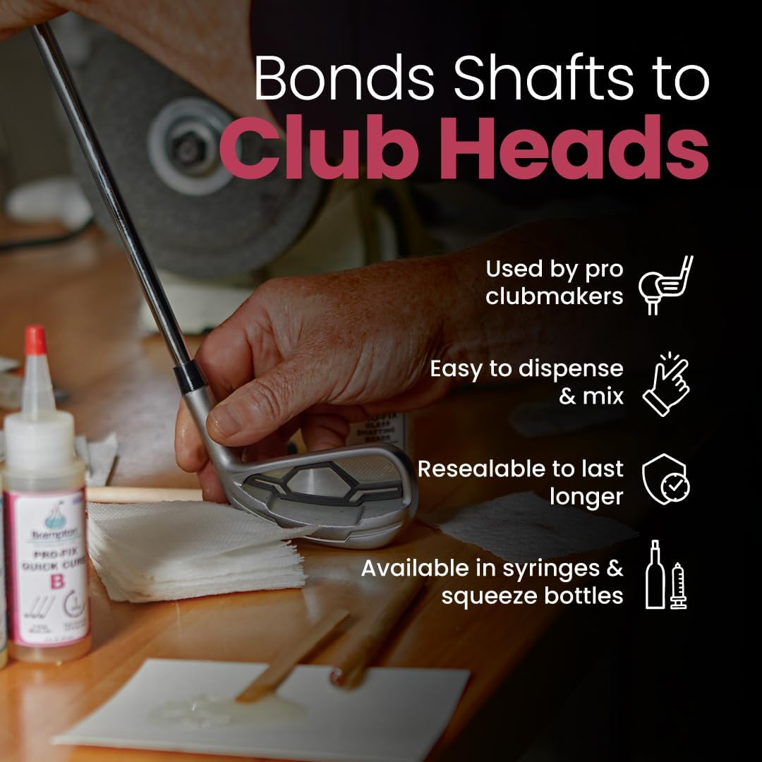 PRO-FIX Long Cure Golf Epoxy was engineered with an extended work life of 20 minutes making it perfect for manufacturing facilities or for building a full set of clubs. This formulation was developed to provide the greatest impact resistance and durability of any golf epoxy in the industry. PRO-FIX Long Cure Golf Epoxy can withstand swing speeds of 130+ mph, making it a preferred epoxy for long drive competitors. PRO-FIX Long Cure Golf Epoxy is the preferred epoxy for building a full set of golf clubs worldwide by professional clubmakers. All PROFIX Golf Epoxies work with all types of golf shafts and golf heads. Before applying any PRO-FIX Golf Epoxy be sure to check out Bramptons in-depth tutorials to learn how to mix and apply golf shaft epoxy (golf epoxy glue) for the best results possible.