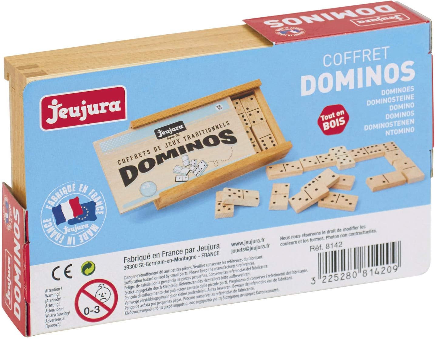 Jeujura dominos game in wooden box is made of wood. Jeujura presents a very wide range of wooden games and toys and does not forget to innovate by developing new themes around the range of houses to be built. Construction set in natural wood and tinted with installation instructions and a play mat. Recommended use for 3 years and above age children.