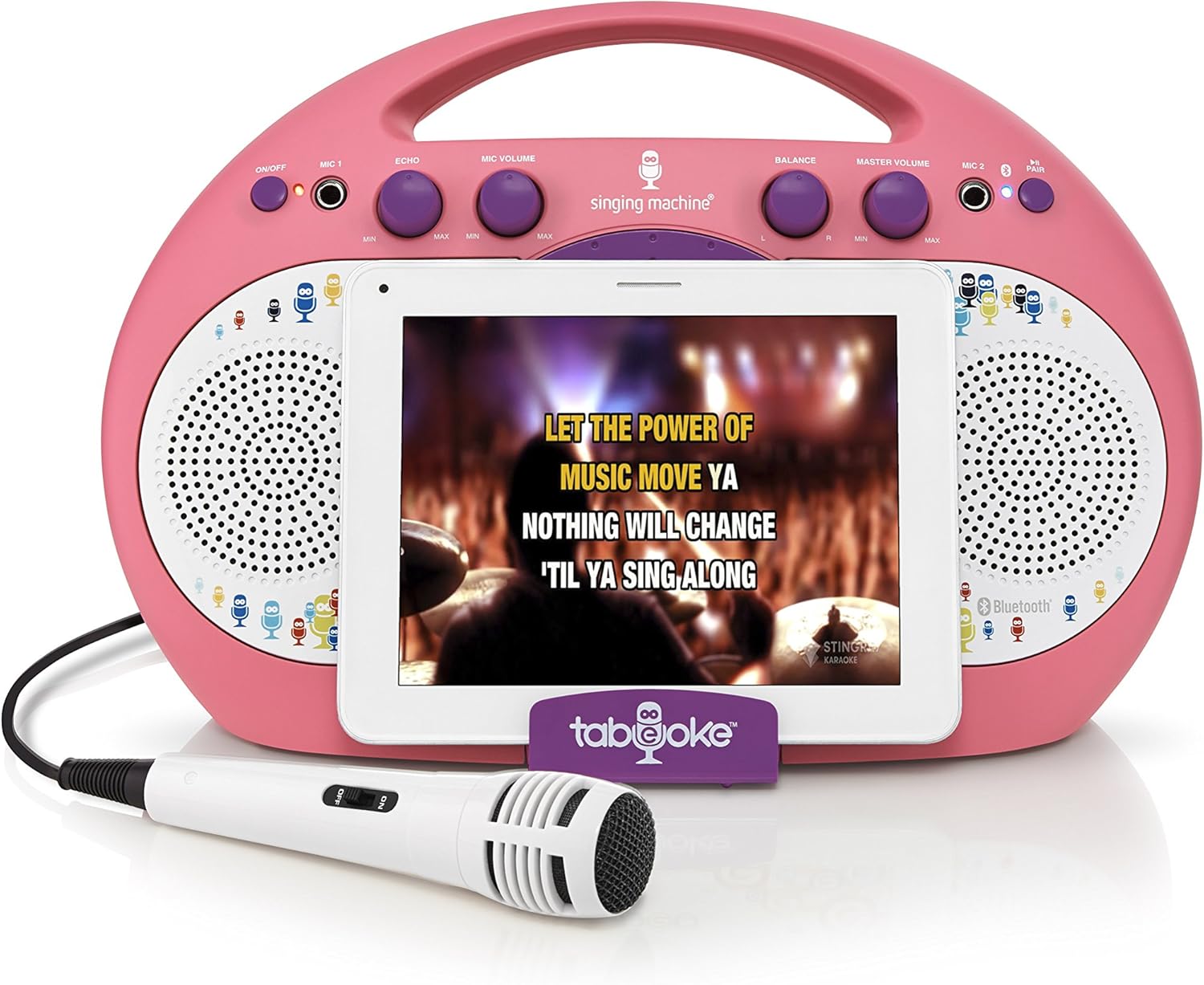 Singing Machine tabooed portable Bluetooth karaoke system with tablet/smartphone cradle and built-in speakers.