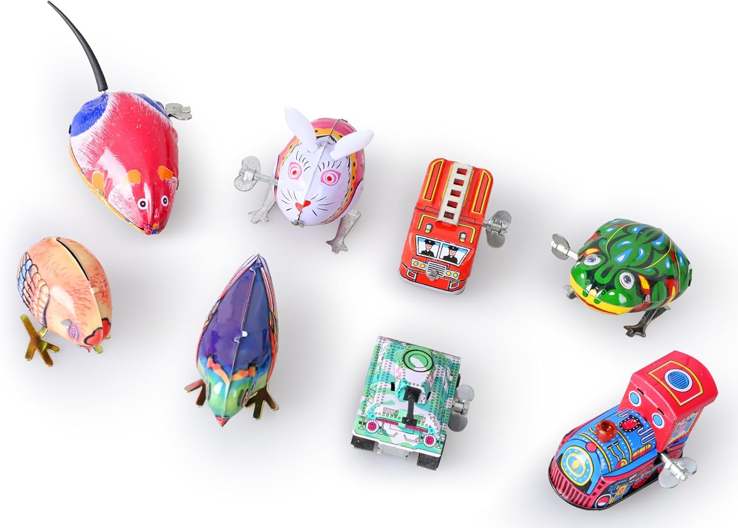 8 pcs Tin Toy Clockwork Collection, Retro 80s Vintage windup Metal Cool Crazy Nerdy Xmas Office Gift, rabbit, frog, bird, mouse, truck, chick, train, tank
