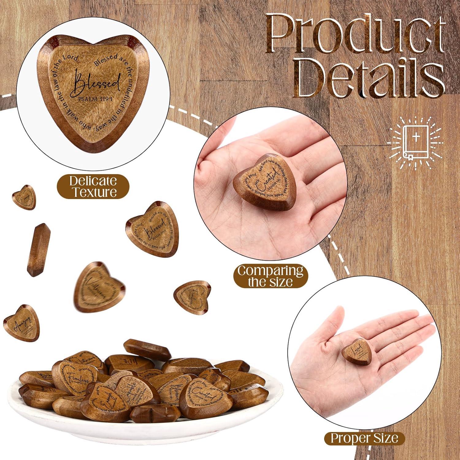 Features: This Christian gift set includes 24 wooden heart tokens with 12 distinct designs, each featuring a distinct Bible verse or motivational message. Compact at 1.2 x 1.2 x 0.2 inches, these tokens offer daily encouragement and spiritual support, fitting easily into pockets or wallets. Ideal for occasions like Valentine's Day, Mother's Day, Father's Day, Pastor Appreciation Day and church events, these sturdy wooden tokens have fade resistant printing. They make a thoughtful gift for loved ones, providing comfort and faith reminders wherever you go. Keep out of reach of small individuals to avoid hazards. Specifications: Material: sturdy wood Color: dark brown wood color (slight variations may occur) Size: 1.2 x 1.2 x 0.2 inches/3.05 x 3.05 x 0.51 cm Package includes: 24 X Dark Brown Wooden heart tokens Notes: Manual measurement, please allow slight errors on size. The color may exist a slight difference due to different screen displays.