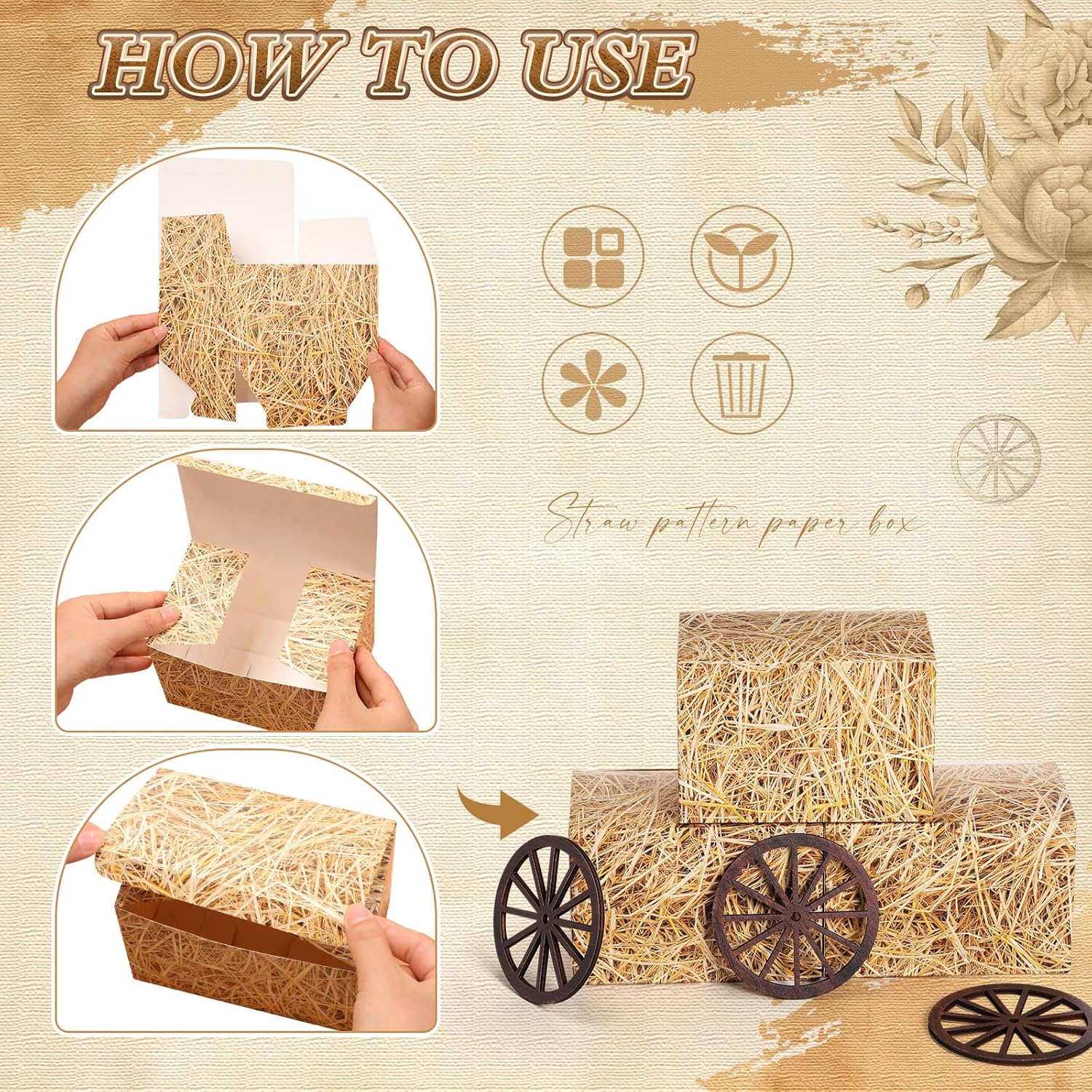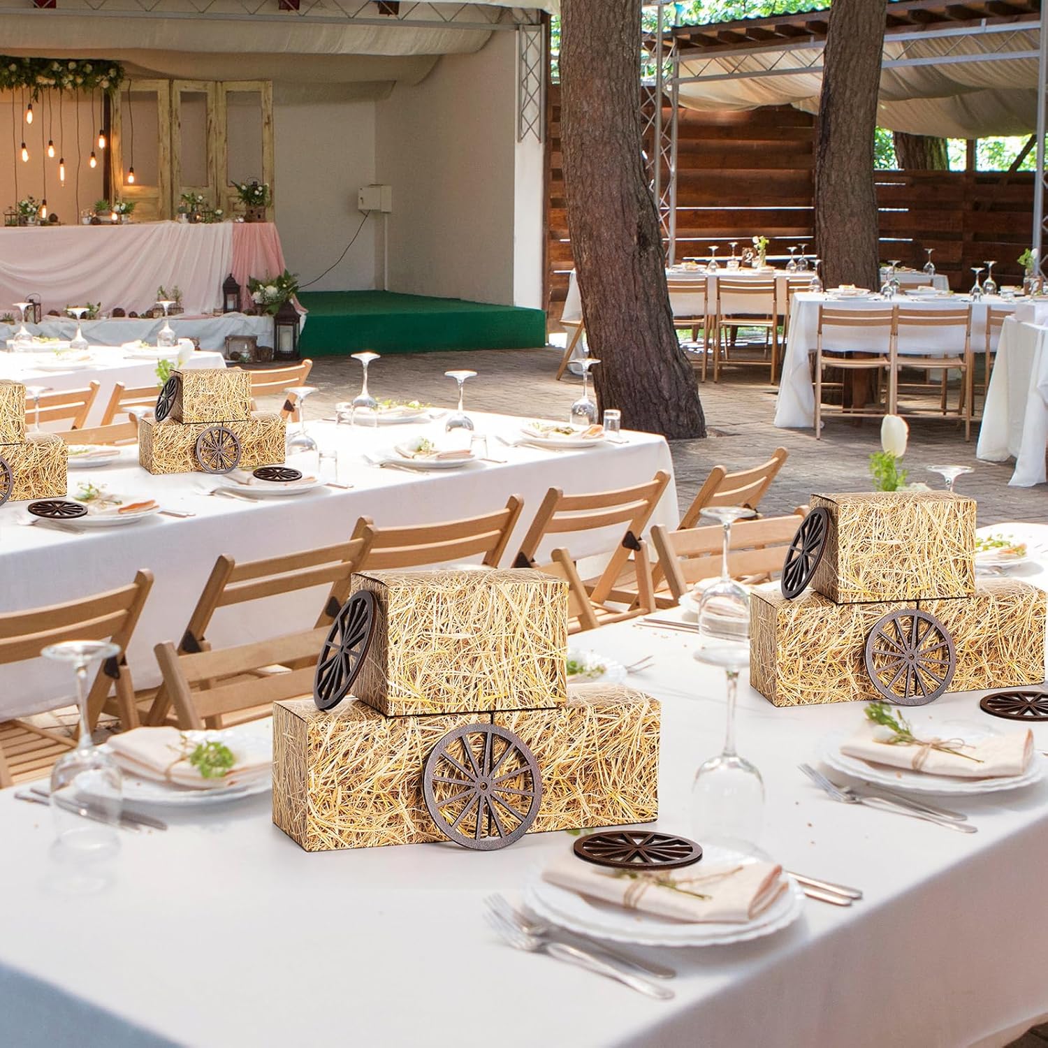Features: Easy assembly: Convenience is a key feature of our western centerpieces. They are easy to assemble in just a few seconds and reduce trouble. This means you can spend more time enjoying your party and less time setting up! Authentic design: The small wooden wagon wheels are designed to be a scaled down version of a real one, adding to the authenticity and charm of your decor. They serve as a charming addition to bedrooms, walls, and more. Specifications: Material: Hay bale boxes: white card Small wagon wheel: wooden Color: brown Size: Hay bale boxes: about 6 x 4 x 4 inches/ 15 x 10 x 10 cm Small wagon wheel: about 4 inches/ 10 cm Package includes: 12 x Hay bale boxes 12 x Small wagon wheel Notes: Manual measurement, please allow slight errors on size. The color may exist a slight difference due to different screen displays.