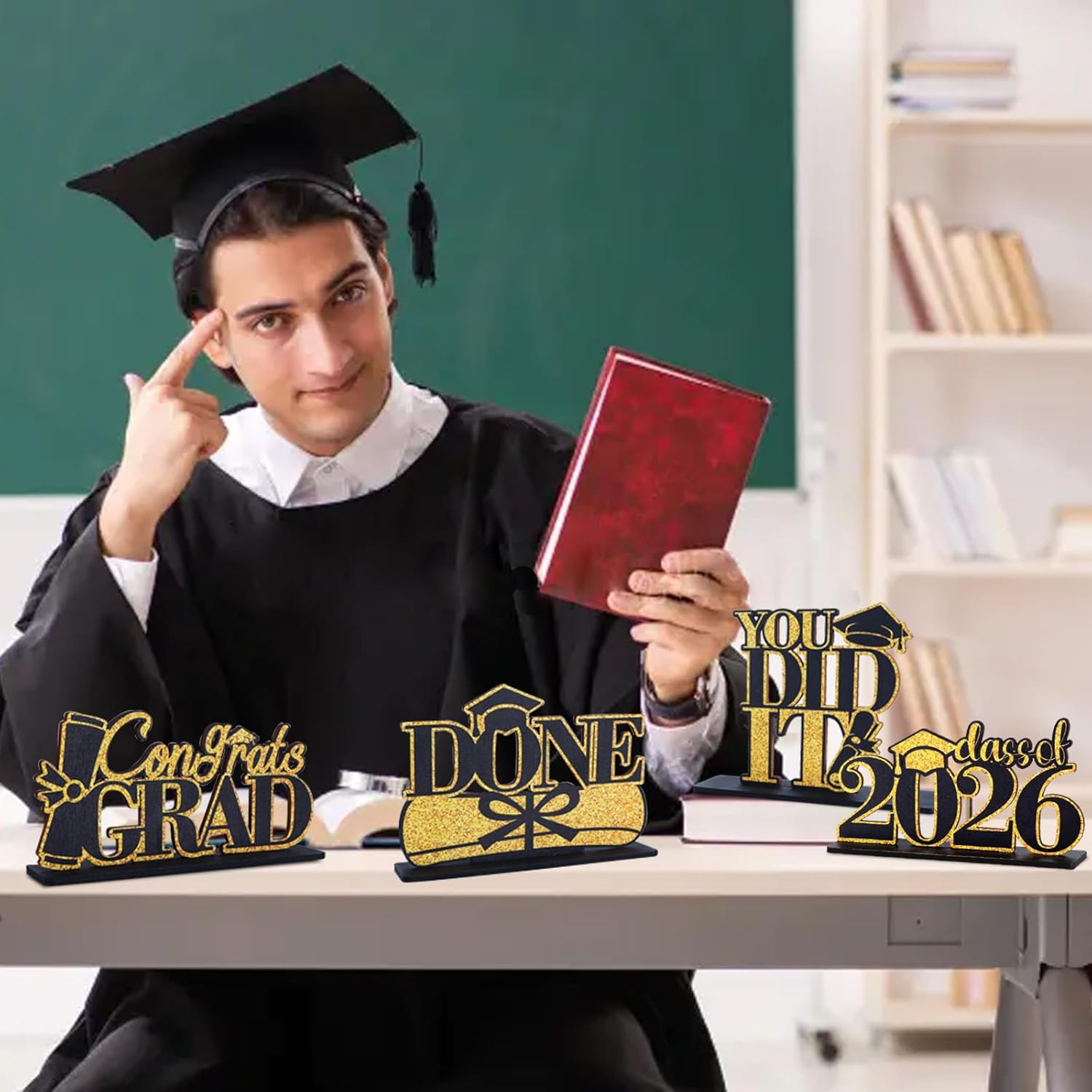 BAOOOFUL 2026 Graduation Decoration Table Centerpieces(Blue Gold)Package:○ 4 centerpieces with wooden bases & signboardsDesign:○ Recessed for stability○ No risk of disassemblyQuality:○ Premium materials○ Vibrant colors○ Detailed printsDimensions:○ Bases: 7.87 inches x 1.96 inches (4 Pcs)○ Signboards:5.66 inches x 5.9 inches(1 Pcs),7.87 inches x 4.37 inches(1 Pcs),7.87 inches x 3.89 inches(1 Pcs),7.87 inches x 5.11 inches(1 Pcs)Perfect for:○ 2026 Graduation Party Decorations○ 2026 Graduation Party Favor Supplies