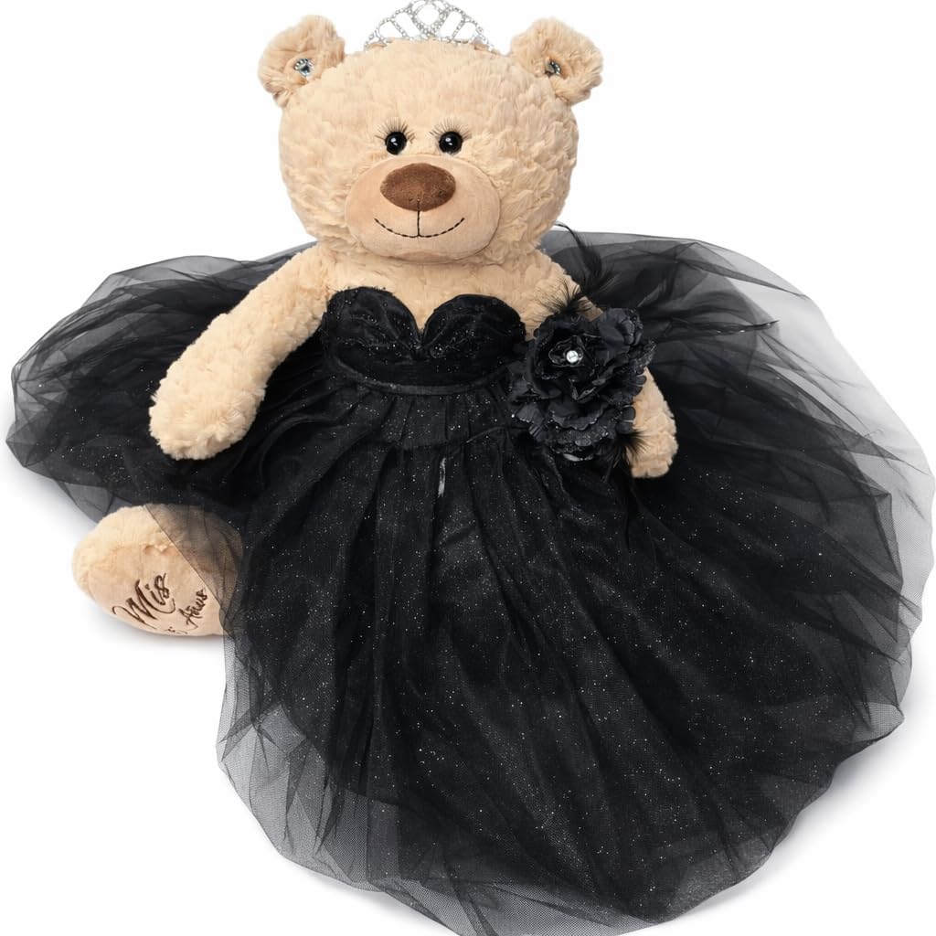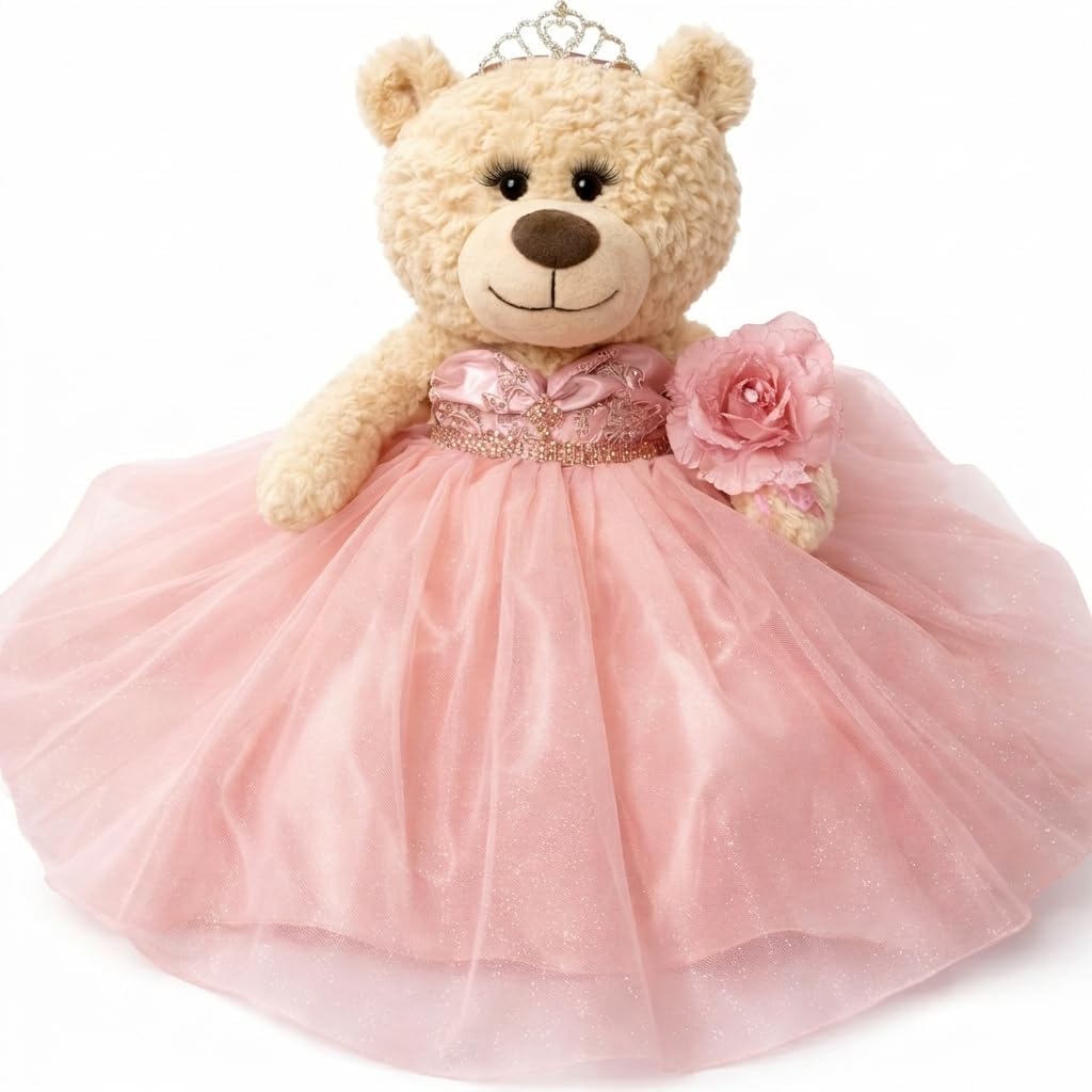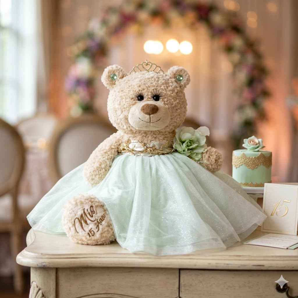 For those looking for something other than a traditional doll, this Beautiful and Elegant Quince Bear Centerpiece offers a unique and meaningful way to celebrate her special day. Measuring 20 inches tall, this light brown-colored quinceañera bear is designed as a decorative keepsake and dressed in a glamorous gown created to stand out as both a gift and table centerpiece (centro de mesa para quinceañera). The bear features long curled lashes for a graceful, expressive look, while the bodice of the dress is adorned with shimmering sequins and a full layered skirt that creates an elegant quinceañera silhouette. Adding a personal and traditional touch, the bear’s right leg is embroidered with “Mis 15 Años.” Each quince bear comes fully accessorized with a sparkling rhinestone tiara, delicate earrings, and a matching wrist bouquet, making it presentation-ready for the celebration. Perfect as a quinceañera centerpiece, decorative display, or mis 15 gift (regalo para quinceañera), this piece is a memorable alternative to a doll and a lasting reminder of her quinceañera milestone. Designed by Latinas in California with a deep appreciation for quinceañera traditions, this quinceañera bear reflects authentic style and careful attention to detail. The gown is crafted using dress-quality satin and layered tulle inspired by traditional quinceañera gowns, offering an elevated finish suitable for display and keepsake purposes. Intended for decorative use only. Recommended for ages 14 and up.