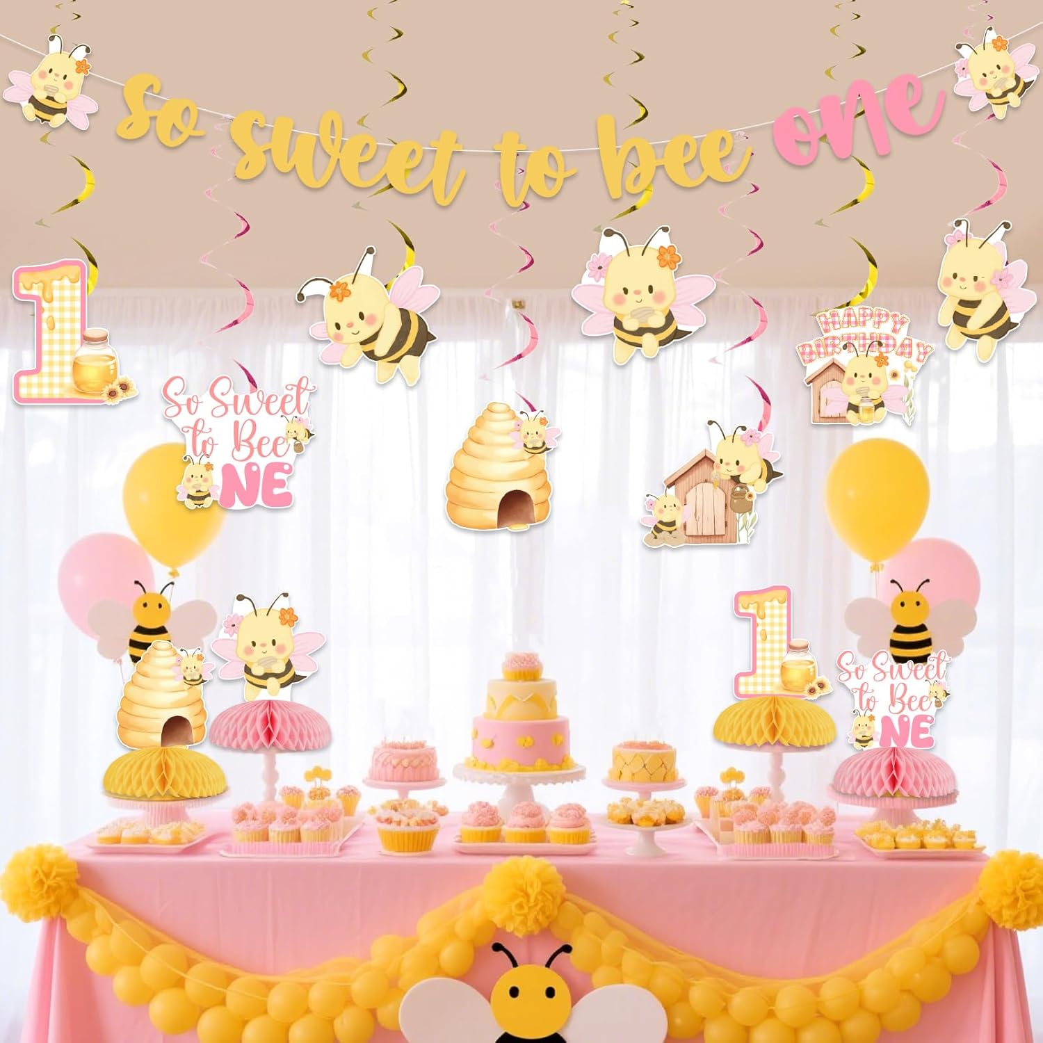 Our bee 1st birthday decoration will create a sweet and playful atmosphere for your girls' first birthday party.Package list: 1pc so sweet to bee one birthday banner 8pcs bee theme hanging swirls 4pcs bee theme honeycomb centerpieces