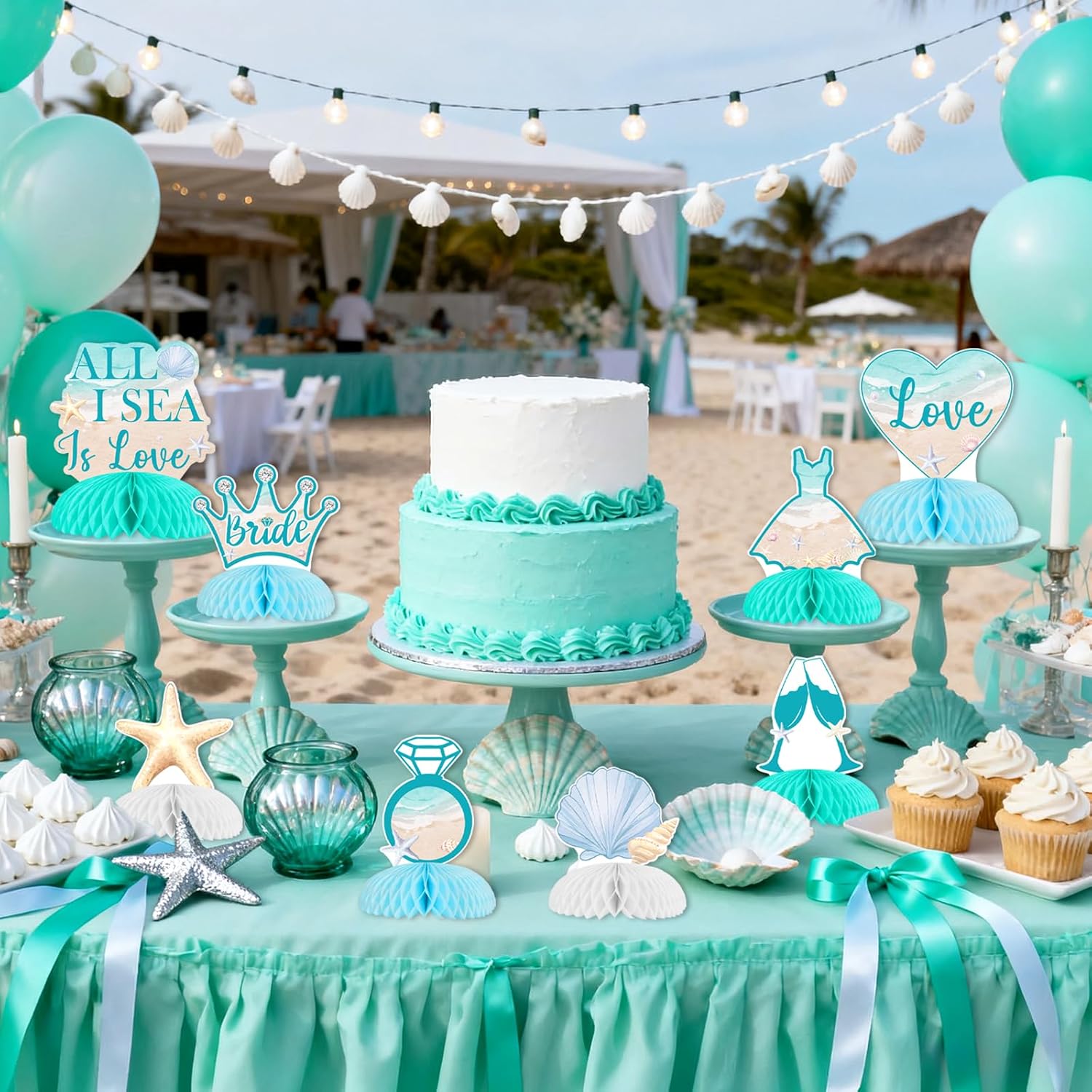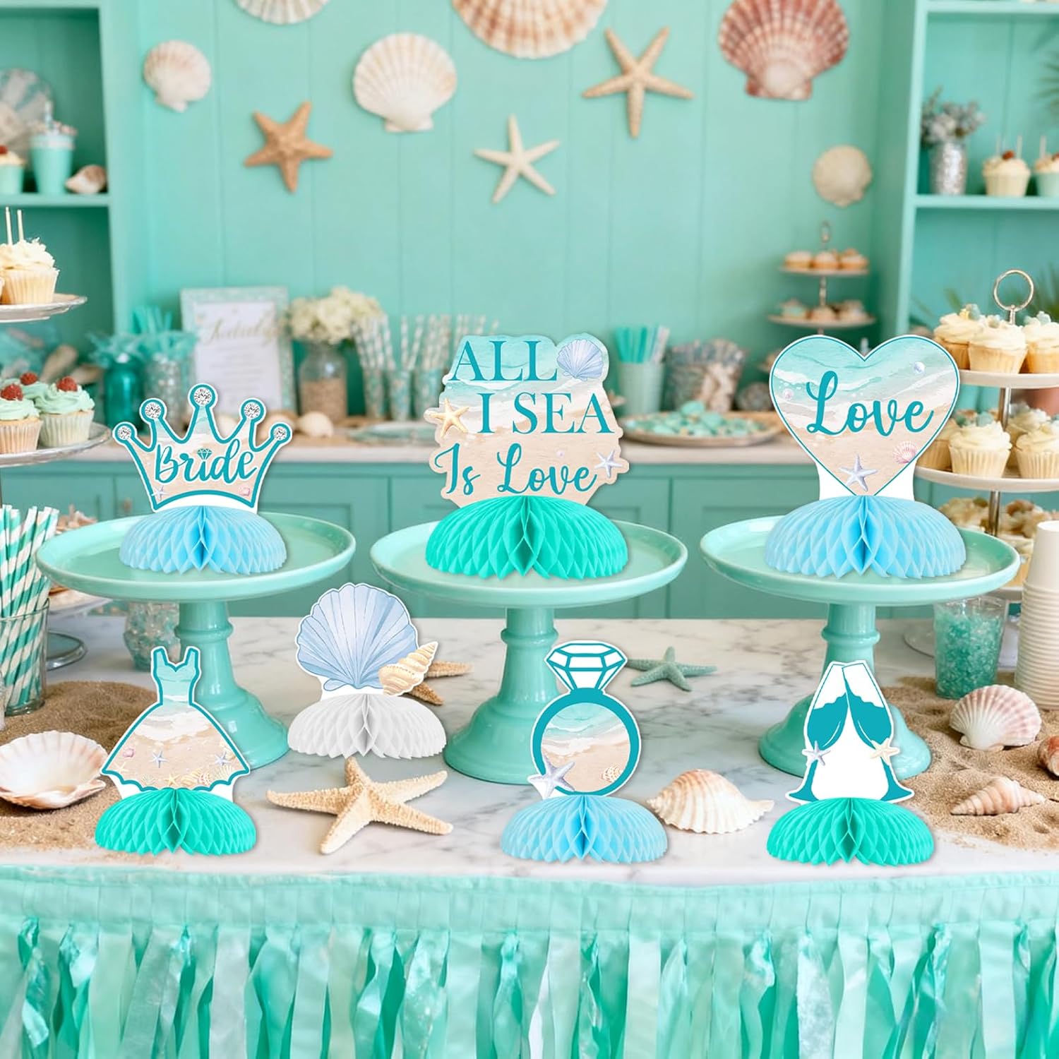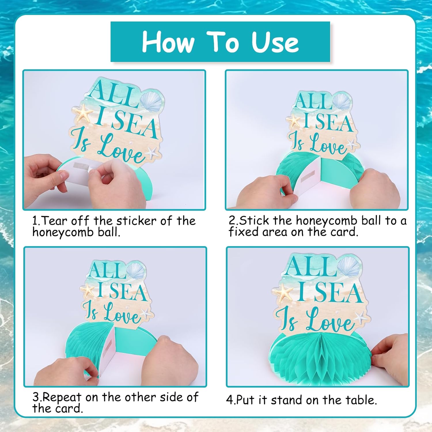 Elevate your beach-themed bachelorette party with our seashell table centerpieces. These decorations, inspired by the ocean, bring a touch of coastal elegance to bridal showers, making the celebration uniquely enchanting.Package include 8*beach seashell table centerpiecesHow to use 1.Tear off the sticker of the honeycomb ball 2. Stick the honeycomb ball to a fixed area on the card 3. Repeat on the other side of the card 4. Put it stand on the table