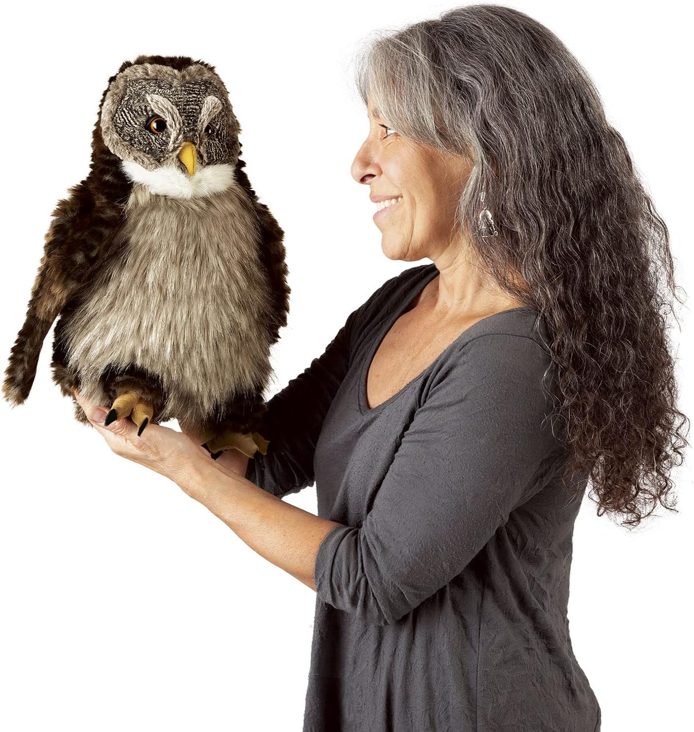 The Folkmanis hooting owl puppet is a big night bird on the hunt for fun. Hear the call of the Wild when you gently squeeze the body of this great gray owl. Fluffy plumage and intricate design details add to the realism of this amazing animal. This puppet measures 7 x 10 x 16 inches (L x w x H).since 1976, Folkmanis has been encouraging young imaginations to Blossom with its innovative and engaging specialty puppets, promoting creativity and discovery while winning nearly every industry, child development, and kid-tested award. Folkmanis has grown to become the premier manufacturer of plush puppets worldwide, offering over 200 of the most heartwarming and realistically designed creatures--both exotic and familiar--on the market today.(Birthday: July 2018)
