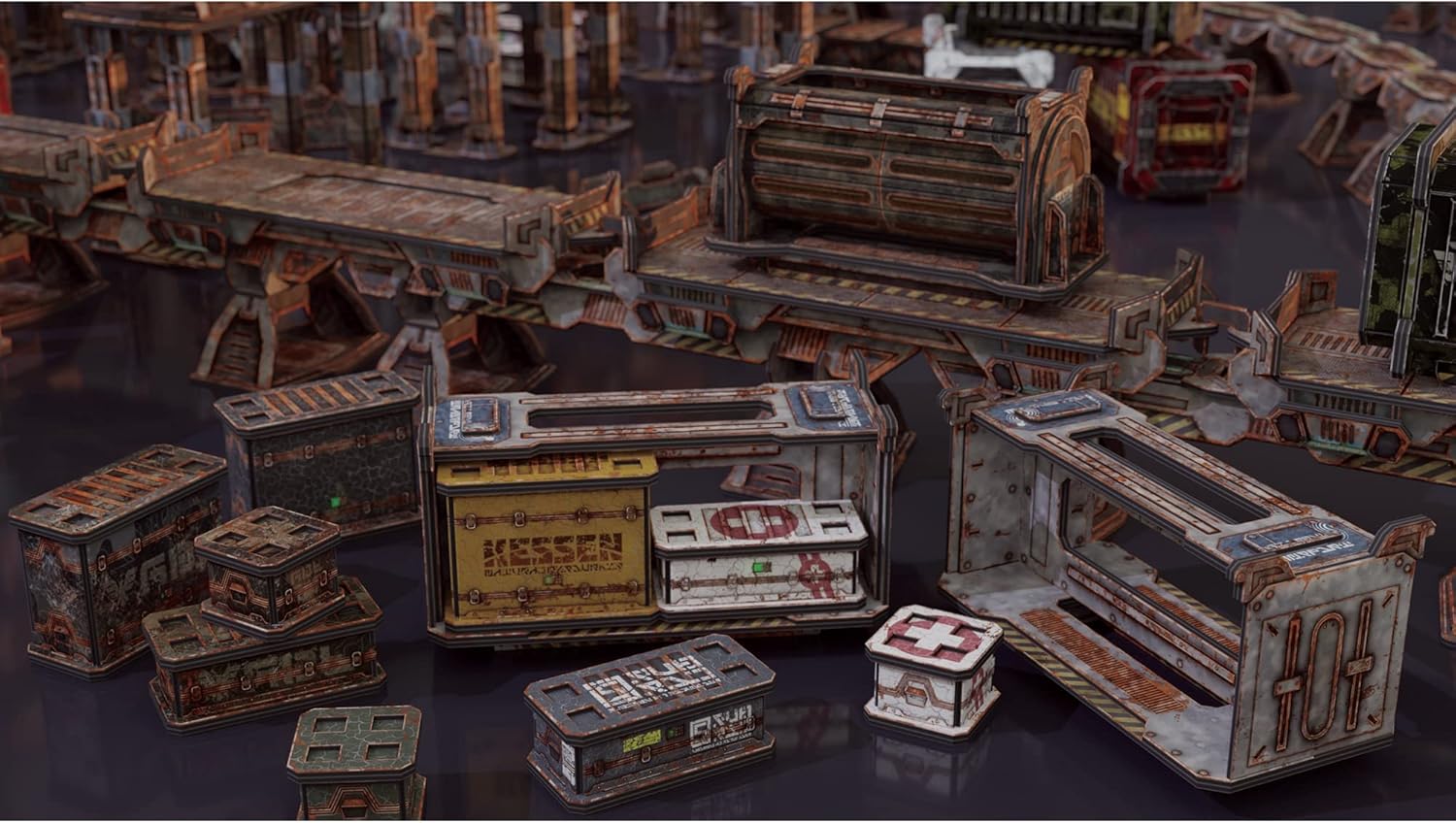 Where would your team take cover if it wasn’t for the industrial shipping industry? This set includes a Tanker and two Crate Containers, sized to fit onto the rail cars and stack nested for more verticality. The Tanker Container comes with two tank artwork styles to choose from, and the Crate Containers hold up to 16 small crates, 8 medium crates, or 4 large crates each. Also included are crates in a medley of sizes and markings to serve as scatter cover for the cautious, or objectives for the bold. INCLUDES: 1 Tanker Container 2 Crate Containers 3 Small Crates 3 Medium Crates 3 Large Crates
