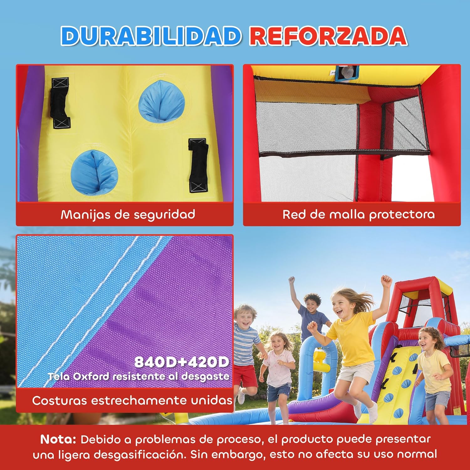 Turn your garden into the center of fun this summer with this multi-function water bouncy castle. Its fast inflation, reinforced materials, and multiple play areas offer hours of refreshing entertainment as kids jump, climb and glide with complete enthusiasm. Features: ● Water bouncy castle with six play areas for complete fun ● Made of 420D and 840D Oxford fabric, resistant to puncture and heavy use ● Fast inflation in about a minute with 550W blower included ● Wide playing surface ideal for children aged 3-8 ● Sprinklers and pool area to cool off on hot days ● Sports and climbing areas that encourage exercise and coordination ● Includes all necessary accessories for immediate use ● Important Note: We do not ship to the Canary Islands, Ceuta and Melilla, or to the Azores and other islands of Portugal Specifications: ● Color: multicolor ● Material: 420D Oxford cloth and 840D Oxford cloth ● Overall dimensions: 470 x 445 x 205 cm (LxWxH). ● Slide measurements: 208 x 90 cm (LxW) ● Pool dimensions: 428 x 202 x 20 cm (LxWxH). ● Climbing wall measurements: 52 x 120 cm (width x height). ● Basketball hoop measurements: Ø22 cm ● Inflator Power: 550W ● Recommended Age: 3-8 Years ● Maximum load: 90 kg ● Reference: 346-027V90MX ● 1 x Water bouncy castle ● 1 x Air blower ● 1 x Hose Set with 3 Nozzles ● 2 x Mini Basketballs ● 1 x Storage Bag ● 1 x Repair Kit ● 1 x Instruction Manual