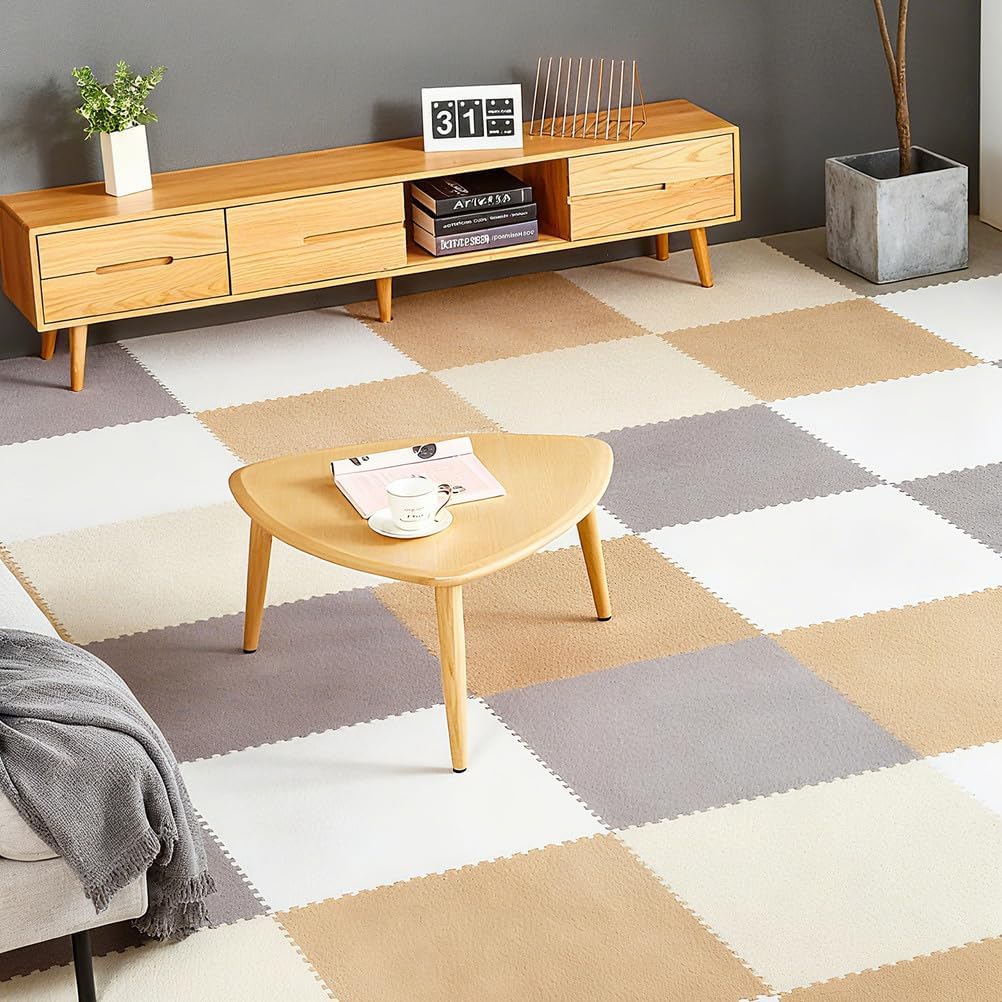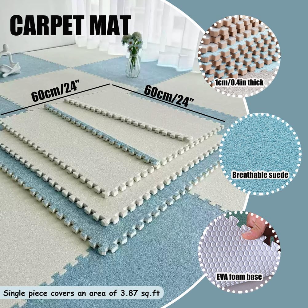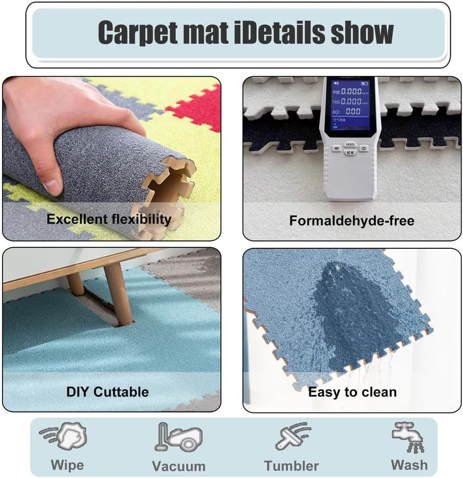 The short pile patchwork carpet tiles feature a patchwork design for easy installation. They combine a soft short pile with a non-slip foam backing, making them easy to clean, lightweight and compact. They adapt to various environments, such as living rooms, yoga studios and playrooms. Available in packs of 6, 10 or 12 tiles, they adapt to the needs of various spaces. Specifications: Name: Plush Carpet Tiles Material: short pile; Base: non-slip EVA foam. Dimensions: 60 x 60 x 1 cm/24 x 24 x 0.4 inches. Quantity:6/10/12pcs Coverage Area: 23 sq ft (6 pieces); 38.7 sq.ft (10 pieces); 46.44 sq.ft (12 pieces) Cleaning: Vacuum/Clean daily with cloth; Hand wash only. Notes: 1. Avoid dragging heavy furniture or placing hot objects on the carpet to prevent lint from melting or damaging the foam. If used in a play area, regularly check joints to ensure safe use. 2. Due to the light and screen setting difference, the item's color may be slightly different from the color shown. Please refer to the actual product received.