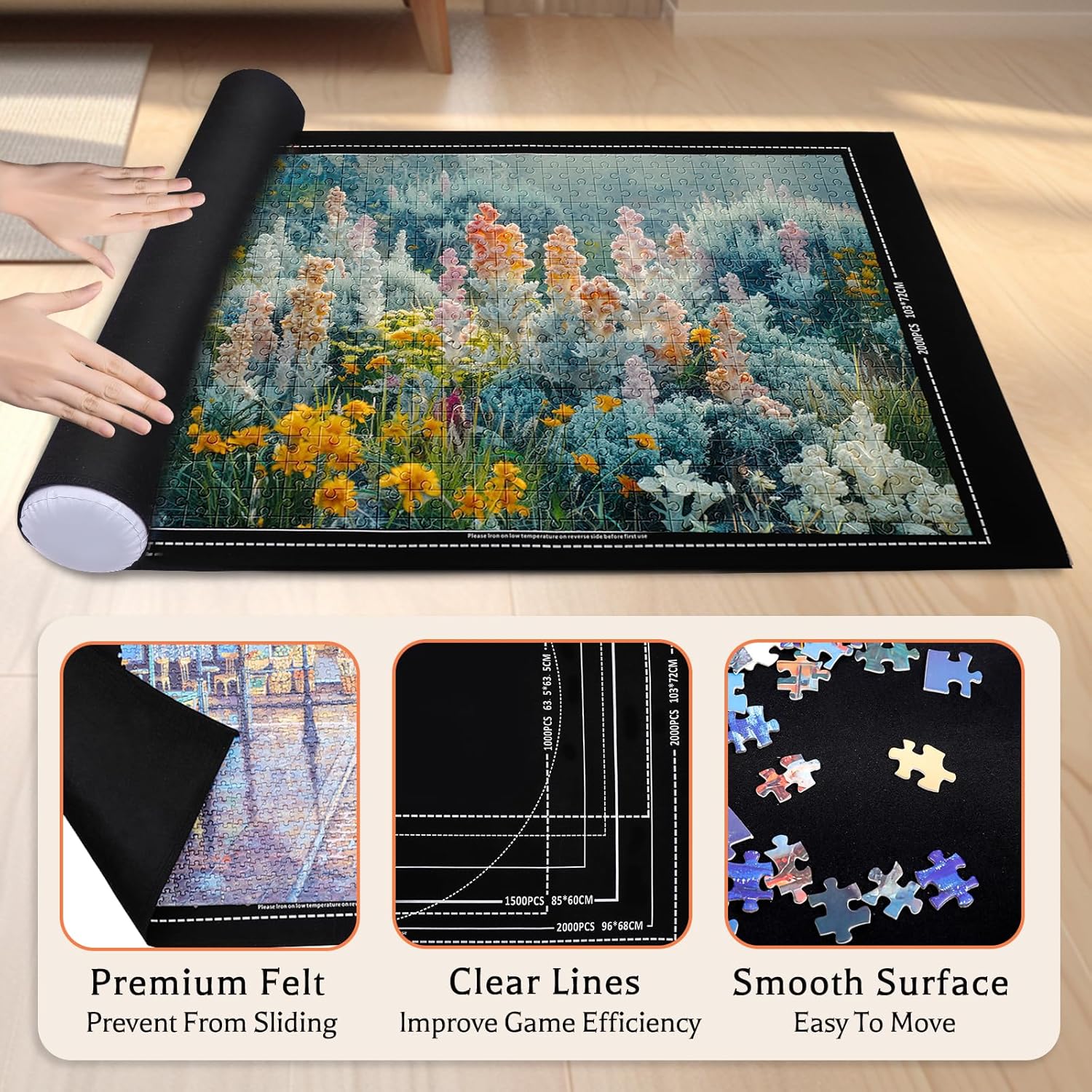 Pohxev Jigsaw Puzzle Mat Roll Up, Felt Saver Pad 43” x 26” Smooth Top Portable Keeper Up to 1500 Pieces with 6 Puzzle Sorting Trays & Travel-Friendly Storage Bag