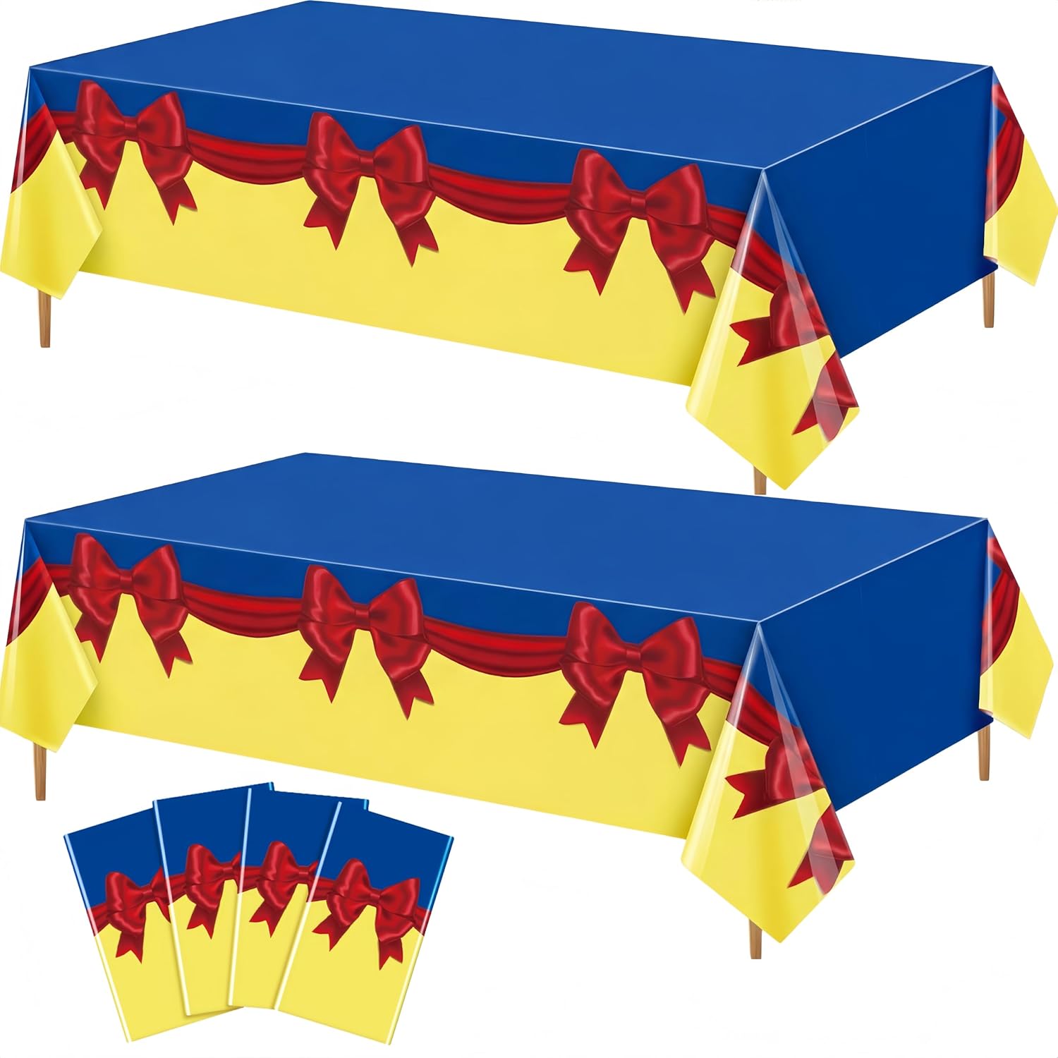 Features: The bow element is classic and versatile, and the princess themed tablecloth makes the dining table a corner to showcase your lifestyle. Specifications: Material: plastic Color: blue, yellow, red Size: about 107.87 x 53.94 inches/ 274 x 137 cm Package includes: 2 x Princess snow themed party tablecloths Notes: Manual measurement, please allow slight errors on size. The color may exist a slight difference due to different screen displays