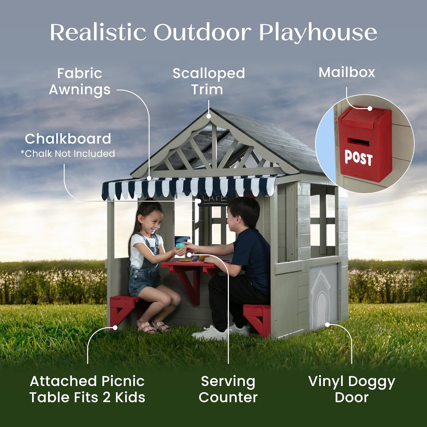 | Included Components | Attached picnic table that fits two kids, serving counter with fabric awning, play kitchen with working sink, mailbox, vinyl doggy door and chalkboard (chalk not included) |