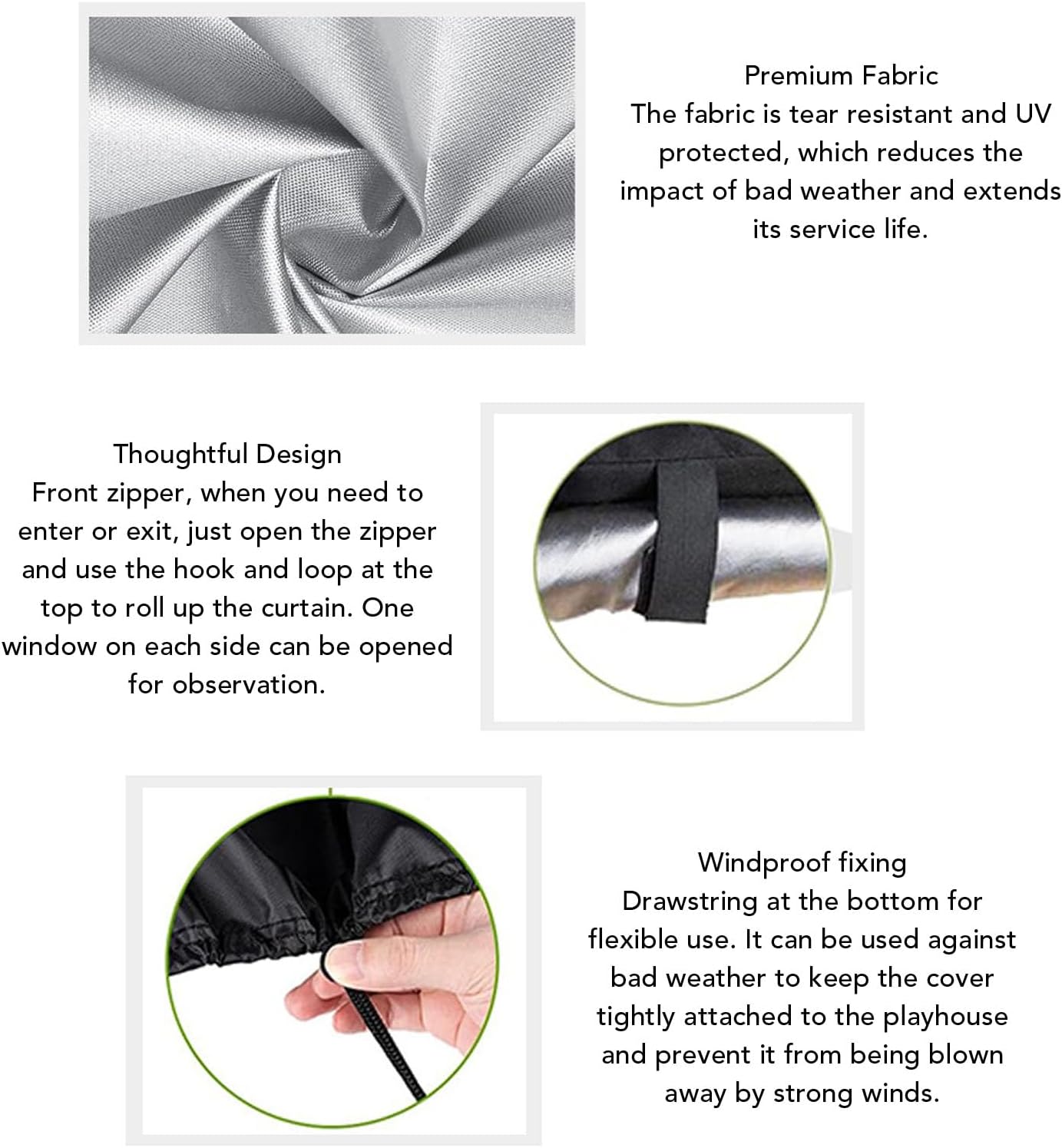 Product description 1. MATERIAL: Made of 420D heavy duty water silver coated oxford fabric, it can better protect your playhouse, no need to worry about your playhouse being affected by bad weather. 2. TIGHT FIT: The bottom is designed with a drawstring to ensure that the cover fits tightly to your playhouse and won't fall off or be blown away by the wind. 3. TEAR : It features double stitching and cross stitching techniques, making it very strong and won't tear. It protects the playhouse well in winter, , spring or fall. 4. EASY ACCESS: 2 sturdy on both the front and back. When you need to get in and out, simply unzip and the front or back of the cover with the top buckle. Each side has a window to open. 5. EASY TO FOLD: It can be folded up when not in use, easy to store, won't take up too much space. Thanks to its material and smooth surface design, you don't need to it every day, just wipe it gently with a rag. Specification: Item Type: Playhouse Cover Material: 420D Water Silver Coated Oxford Fabric Weight: Approx. 870g / 30.7oz Product Size: Approx. 142.2x142.2x152.9cm / 56.0x56.0x60.2in How to Use: Use it directly. PackageList: 1 x Playhouse Cover 1 x Storage Bag Manufacturer Contact Information 1
