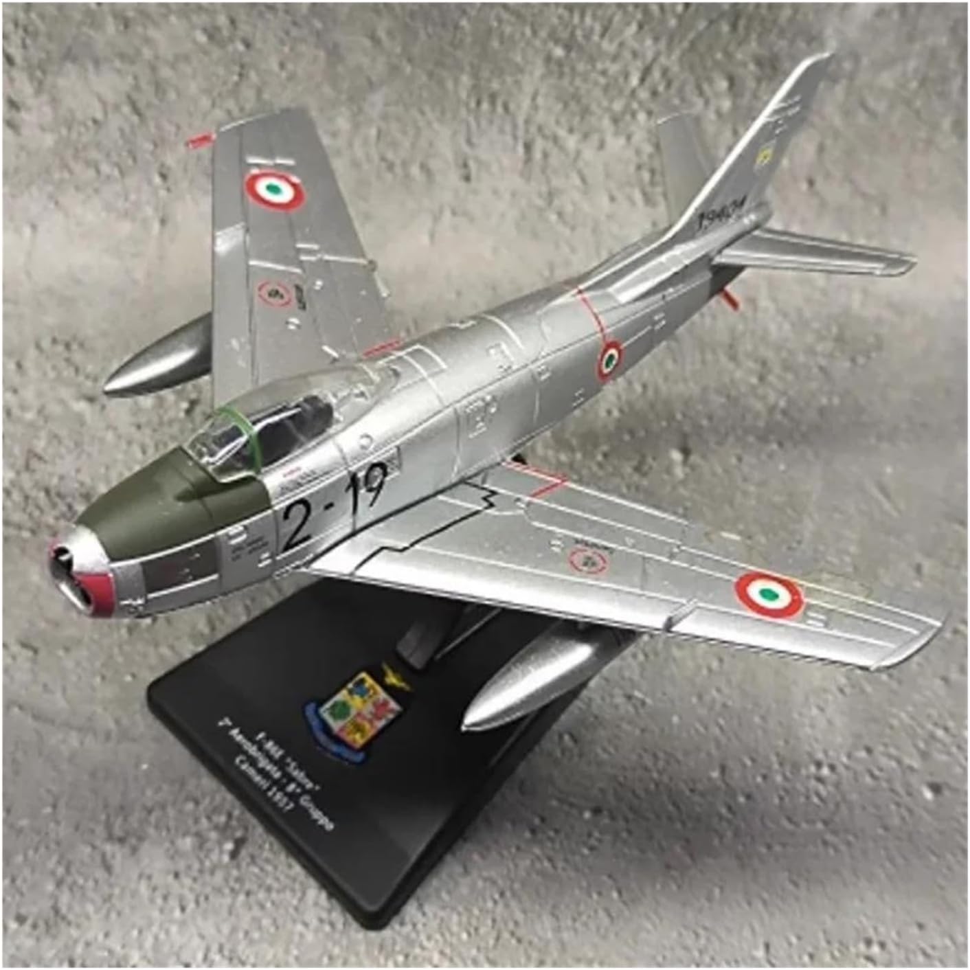 This die-cast metal airplane model toy is cast as a whole, with its authentic design and sensory features, it is not only a collector's item, but also a perfect gift for aviation enthusiasts. It allows you to share and recall the story and history of this aircraft with your friends and family, allowing your friends to appreciate this charm and story.Flying ornaments on the desktop Model Type/Scale: 1/100 for Italian Air Force One F86 This is not only a model, but also an accurate scale build of a die-cast metal model. It is made of alloy and strictly based on the real aircraft data in miniature. From the fuselage outline to the angle of the wings, all of them are accurate. The surface is meticulously finished. Its placement adapts to a variety of occasions. It can be placed on a desk or bookshelf as a decoration, adding a sense of calmness to the work environment; it is suitable for friends interested in aviation as a meaningful gift; it can also be a display in the home, provoking conversation about flight and machinery.