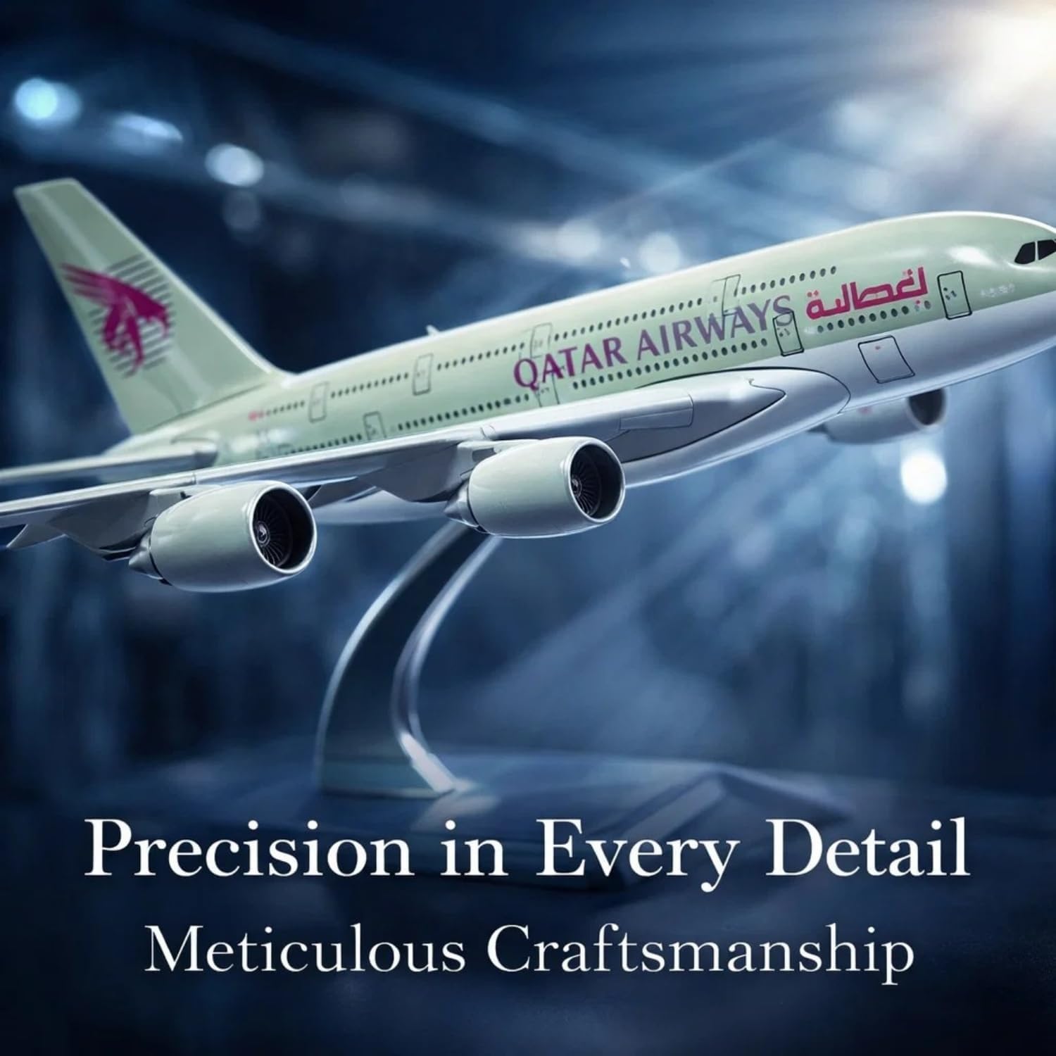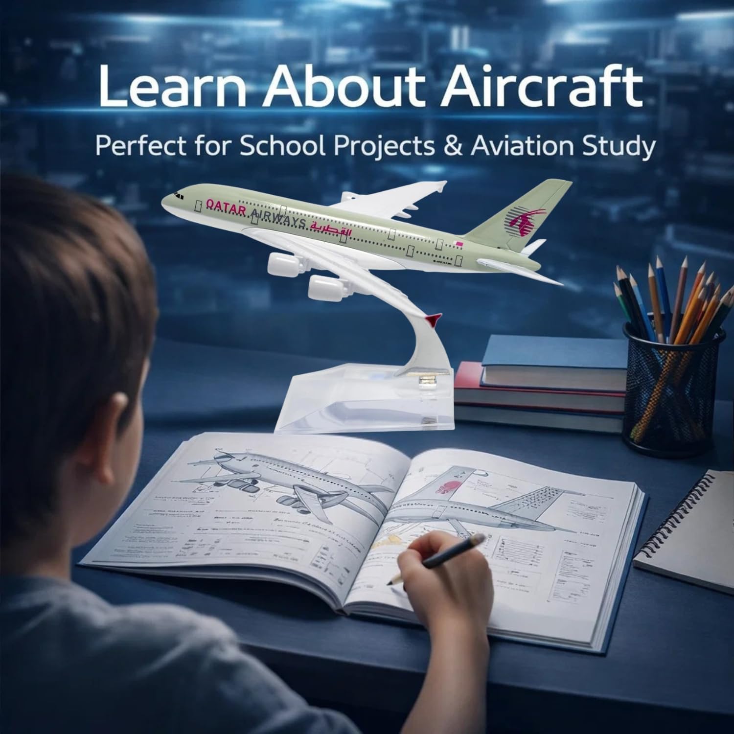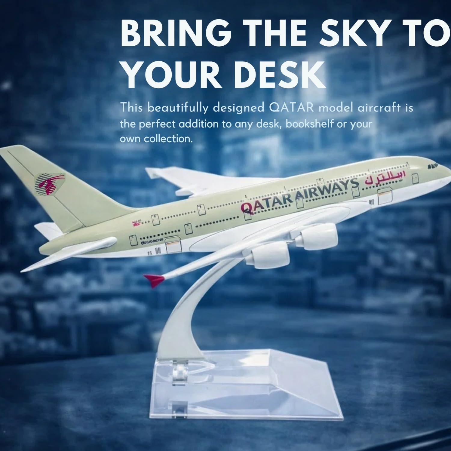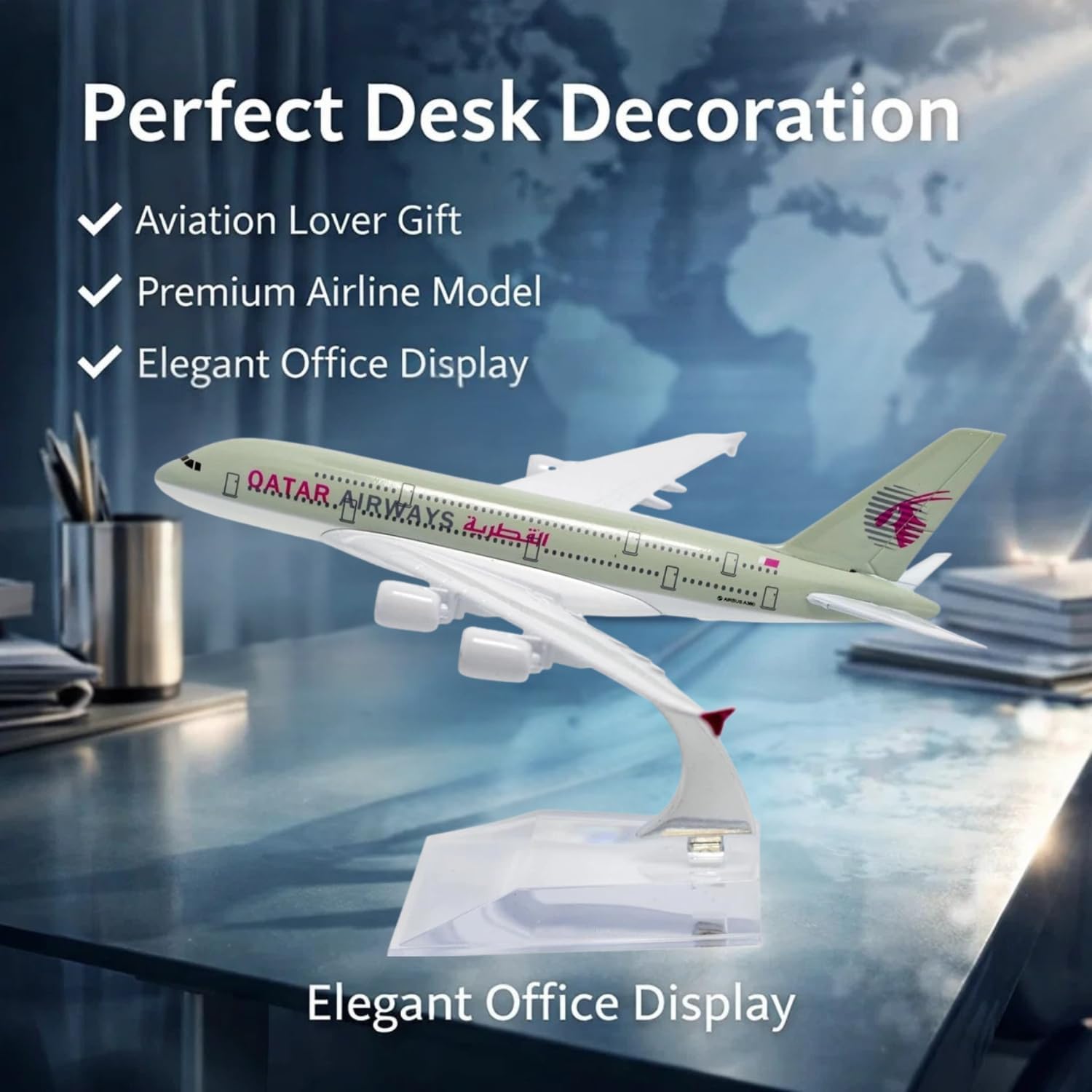 Bring home the grandeur of international aviation with the Qatar Airways A380 1 : 300 Metal Die-Cast Aircraft Model — a finely crafted miniature that captures the beauty and innovation of modern flight. At 16 cm in length, this compact yet detailed airliner offers an ideal blend of elegance, authenticity and practicality for collectors, aviation professionals and decor enthusiasts alike.Crafted with Precision & Purpose:The Qatar A380 model is constructed from die-cast metal and reinforced ABS components to achieve both strength and refinement. Each section — the cockpit, wings, tail and engine pods — is carefully shaped to mirror the graceful architecture of the real aircraft. Its smooth finish and accurate paintwork highlight the Qatar Airways color scheme and signature tail logo, creating a miniature that is both realistic and visually appealing.The metal composition ensures durability while maintaining a balanced weight that feels solid in hand and stable on display. It resists chipping and fading, allowing it to retain its shine and polish for years, even with regular use or movement.Elegant Acrylic Stand:Each model comes with a transparent acrylic display stand that holds the aircraft in a flight-takeoff position. The crystal-clear base adds sophistication while focusing attention on the plane itself. The stand is lightweight, easy to assemble and can be detached for storage or transport. When placed on a desk or shelf, it creates a captivating “in-motion” display effect that adds life to any space.A Perfect Gift for Aviation Fans:Whether you’re celebrating a special occasion or simply want to inspire someone who loves flying, this Qatar A380 metal model makes an excellent gift. It’s ideal for pilots, students, travel agents and frequent flyers who cherish air travel and aircraft design. Its sleek look and symbolic value make it a conversation starter in both professional and personal spaces.Educational & Inspirational Value:Beyond being a display item, this model is an effective visual aid for explaining aerodynamics, airplane components and mechanics. It encourages interest in aviation and STEM subjects among young learners. The Qatar A380 miniature reminds its owner of progress, discipline and innovation — qualities at the heart of modern engineering and air travel.Compact Design & Display Versatility:At 16 cm in length, this airplane model offers a perfect balance between detail and portability. It fits effortlessly on office tables, glass showcases or bedroom shelves without taking excess space. Its metallic paint reflects light beautifully, and the clear stand gives the appearance of flight — making it a charming addition to any decorative arrangement.Why Choose This Qatar A380 Model:– Die-cast metal construction with precise engraved details.– 1 : 300 scale for realistic proportions and visual impact.– Clear acrylic stand for a professional, in-flight display look.– Compact and lightweight for easy placement and storage.– Suitable for education, decoration and collection.– A symbol of flight, freedom and global connection.Conclusion:Celebrate the spirit of innovation and global travel with the Qatar Airways A380 16 cm Metal Model. Its refined craftsmanship, durable structure and realistic finish make it more than just a toy — it’s a tribute to modern aviation and the passion for flight. Whether you display it at home, gift it to an aviation enthusiast or use it as an educational piece, this model brings a touch of wanderlust and engineering marvel to your world.