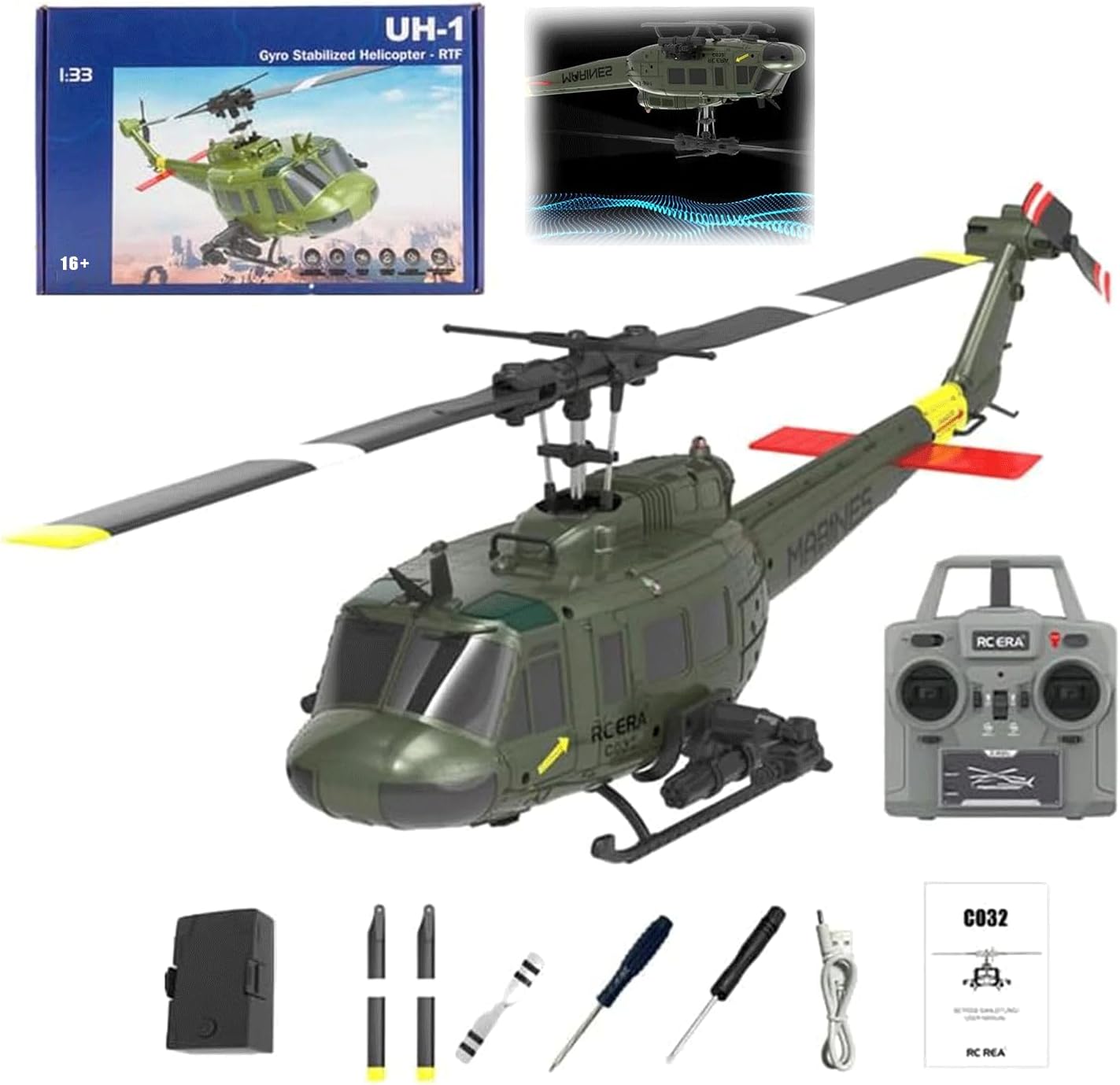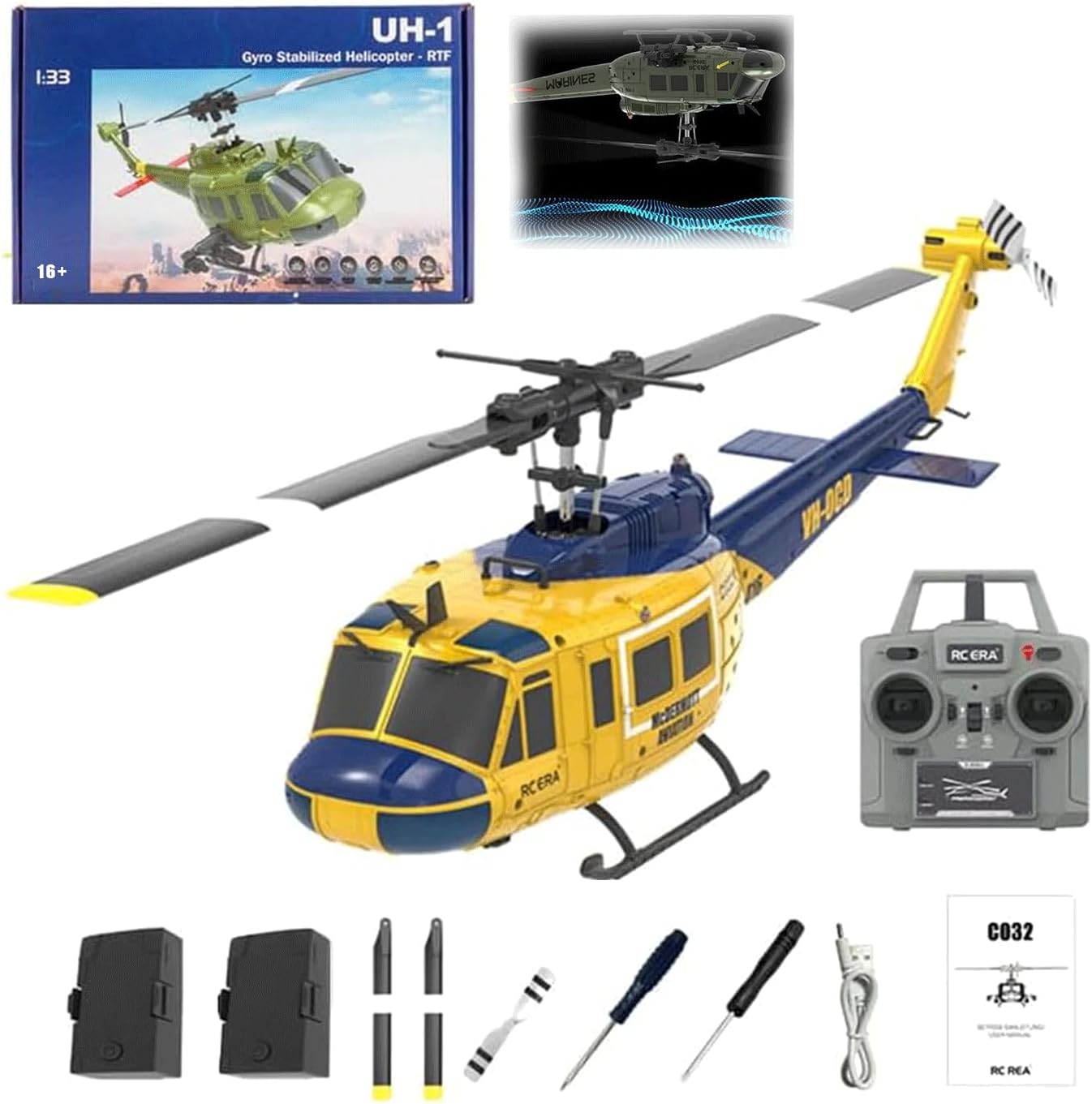 Specifications:Rotor Diameter:315mmBody Length:297mmHeight:92mmFlying Weight:115gFlight Time:Approximately 13 minutesCharging Time:Approximately 50 minutesRemote Control Mode:2.4G remote controllerRemote Control Range:120-150 meters.Package Weight: 660g.Package Dimensions: 34.5 x 22.2 x 9.2cm.Packing: Graphic Carton.Ages: 16+Battery:7.4V battery for the helicopter(included),4*1.5AA batteries for the transmitter(not included)Package IncludingPackage Listing:Helicopter*1Transmitter*1User Manual*1USB Charger*1Main Blades *2Tail Blade*1Lithium Battery*1Screwdriver*1Hex Wrench*1