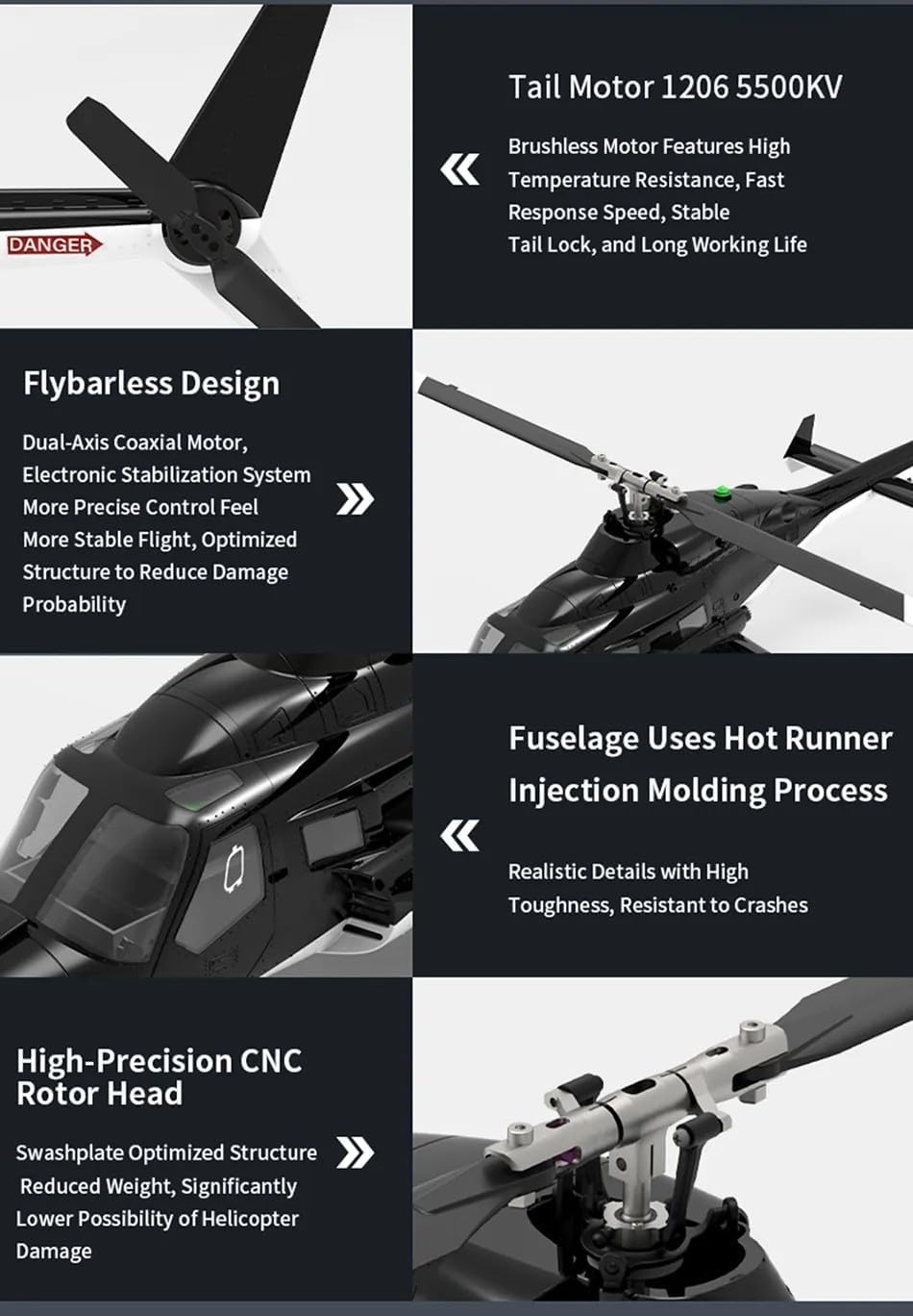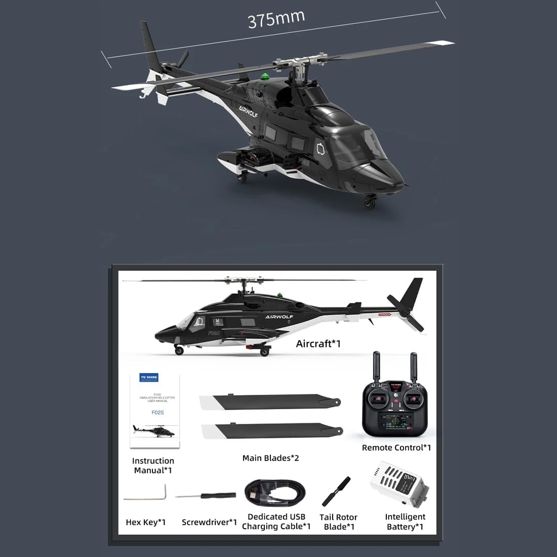 【Product Parameters】Model: F02S AirwolfRotor Diameter: 375mmFuselage Length: 415mmHeight: 118mmMaterial: Nylon + Carbon Fiber + Engineering CompositeWeight: 310g (with battery)Battery: 7.4V 1200mAh 25C Smart Li-PoCharging Time: Approx. 60 minutesFlight Time: 10–12 minutesControl Distance: >120 metersControl System: 2.4GHz 8CH with Real-Time FeedbackPackage IncludingPACKAGING LISTAircraft ×1Remote Control ×1Instruction Manual ×1Dedicated USB Charging Cable ×1Main Blades ×2Tail Blade ×1Smart Battery ×1