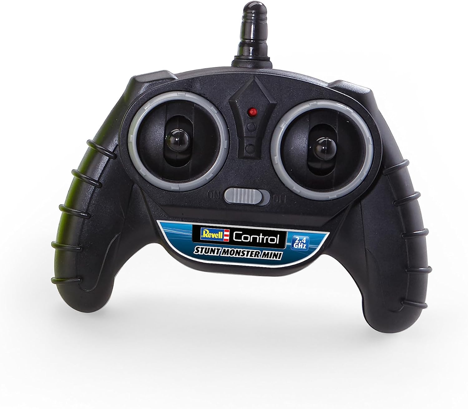 With the Stunt Monster Mini 1080, you can experience lots of stunt car action including spins and flips. Thanks to the powerful four-wheel drive, any obstacle can be overcome. Whether 180° flips or 360° spins, many cool stunts are possible. Whether during the day or night, the effectively illuminated LED wheels show you the way. Thanks to the 2.4 GHz technology, you can go on the slopes together with your friends. Robust chassis with powerful four-wheel drive. LED illuminated rubber tyres (4 x 1.5 V AA battery and 1 x E-block 6LR61 required / not included). Box contents: 1 x model, 1 x 2CH GHz transmitter, 1 x instructions (English language not guaranteed)