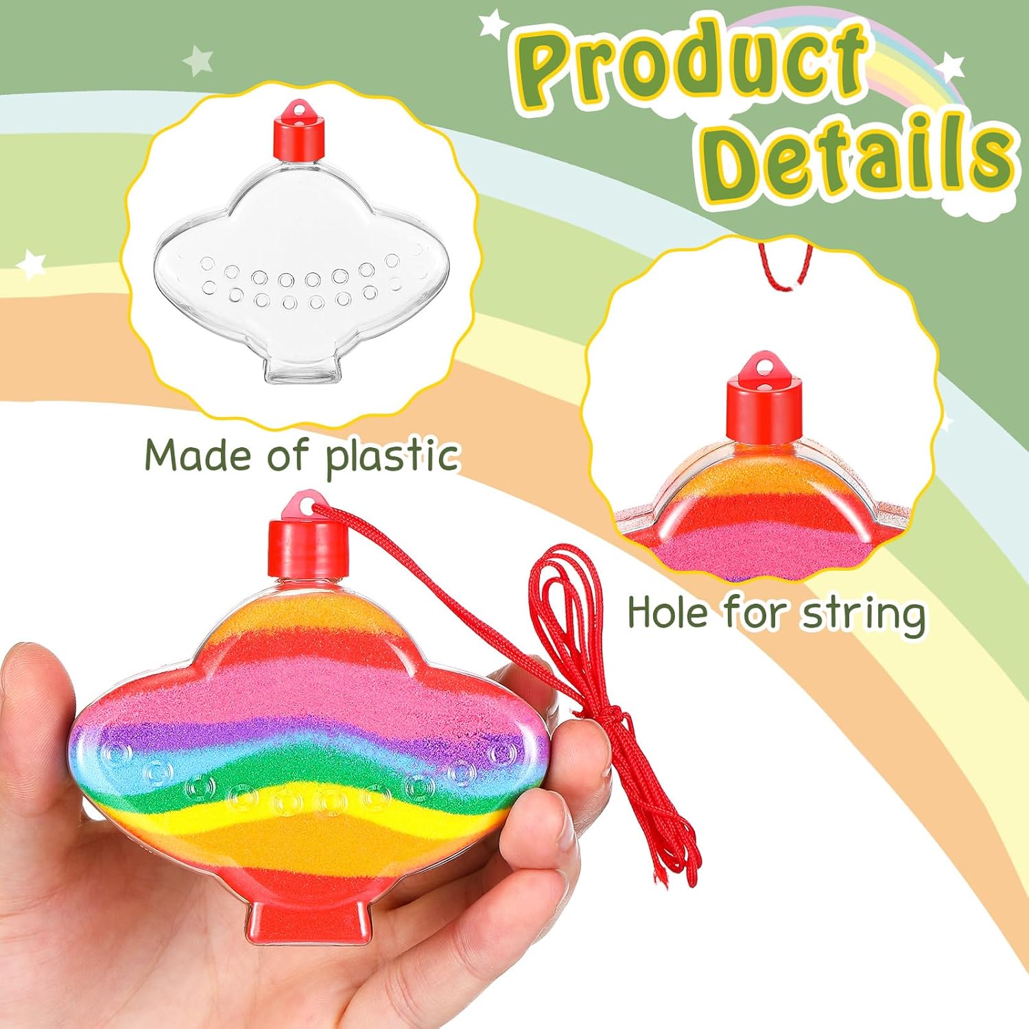 | Additional Features | Clear plastic funnels, 30 red ropes for sand art bottles |
