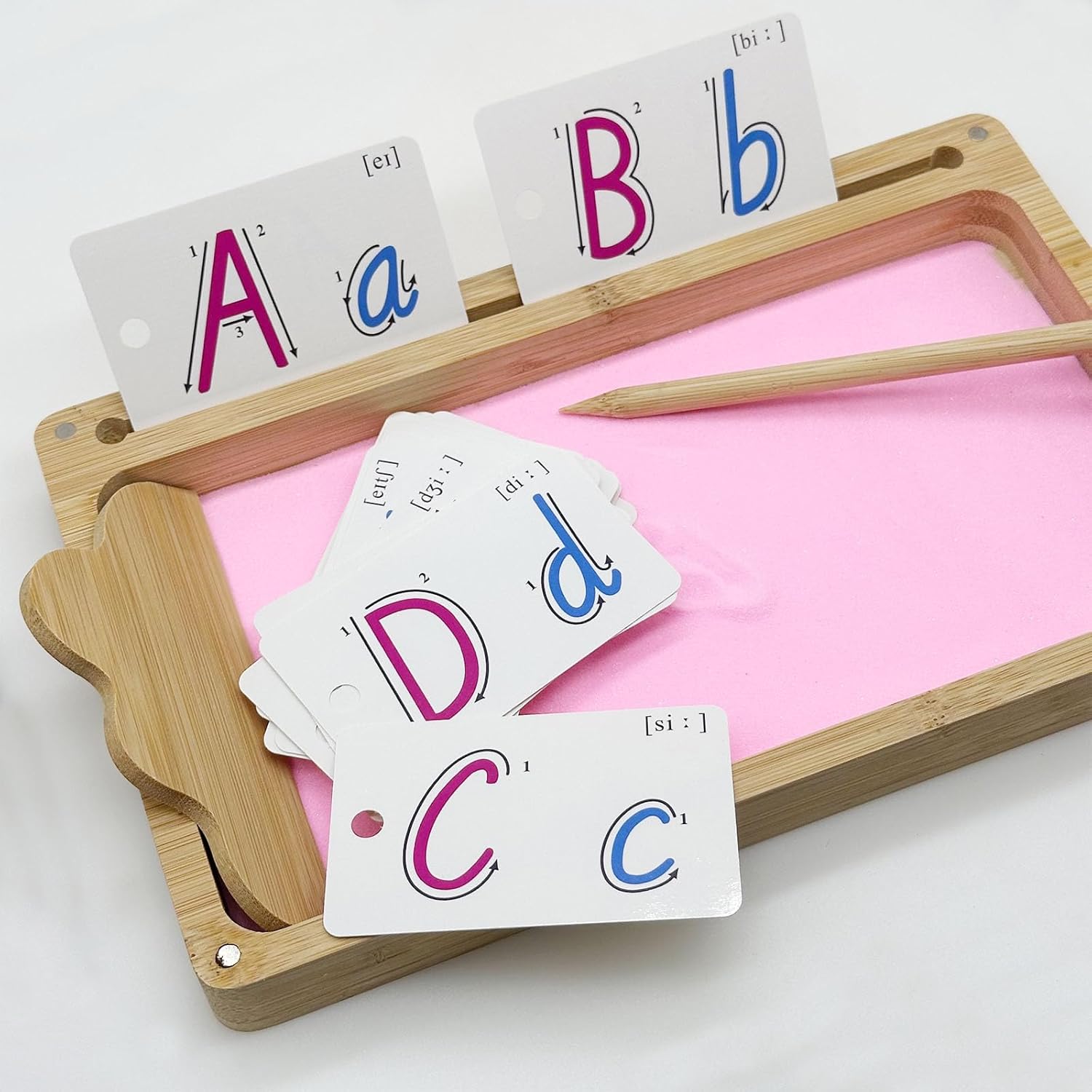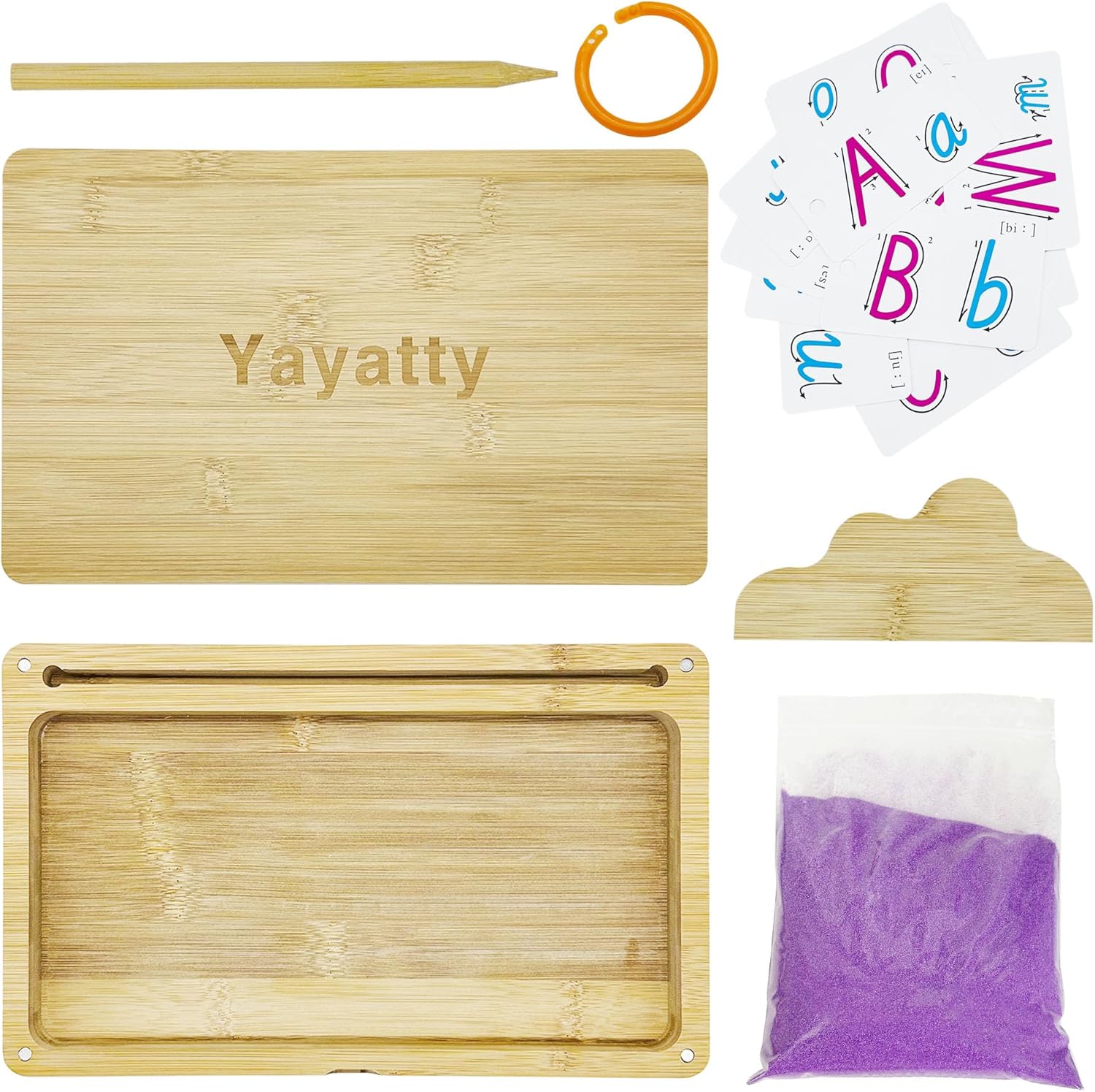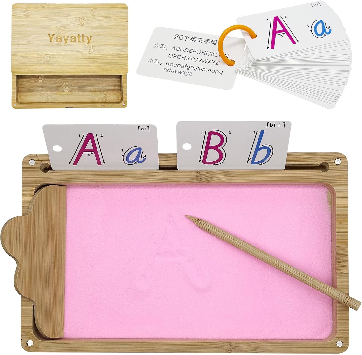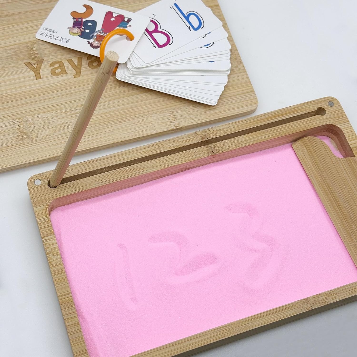 | Included Components | Wooden sand tray with lid, Wooden scraper, Wooden pen, Packet of pink sand, 26 cards with upper and lower case letters, Magnetic lid, Deep tray, Slots for wooden stylus and flashcards |