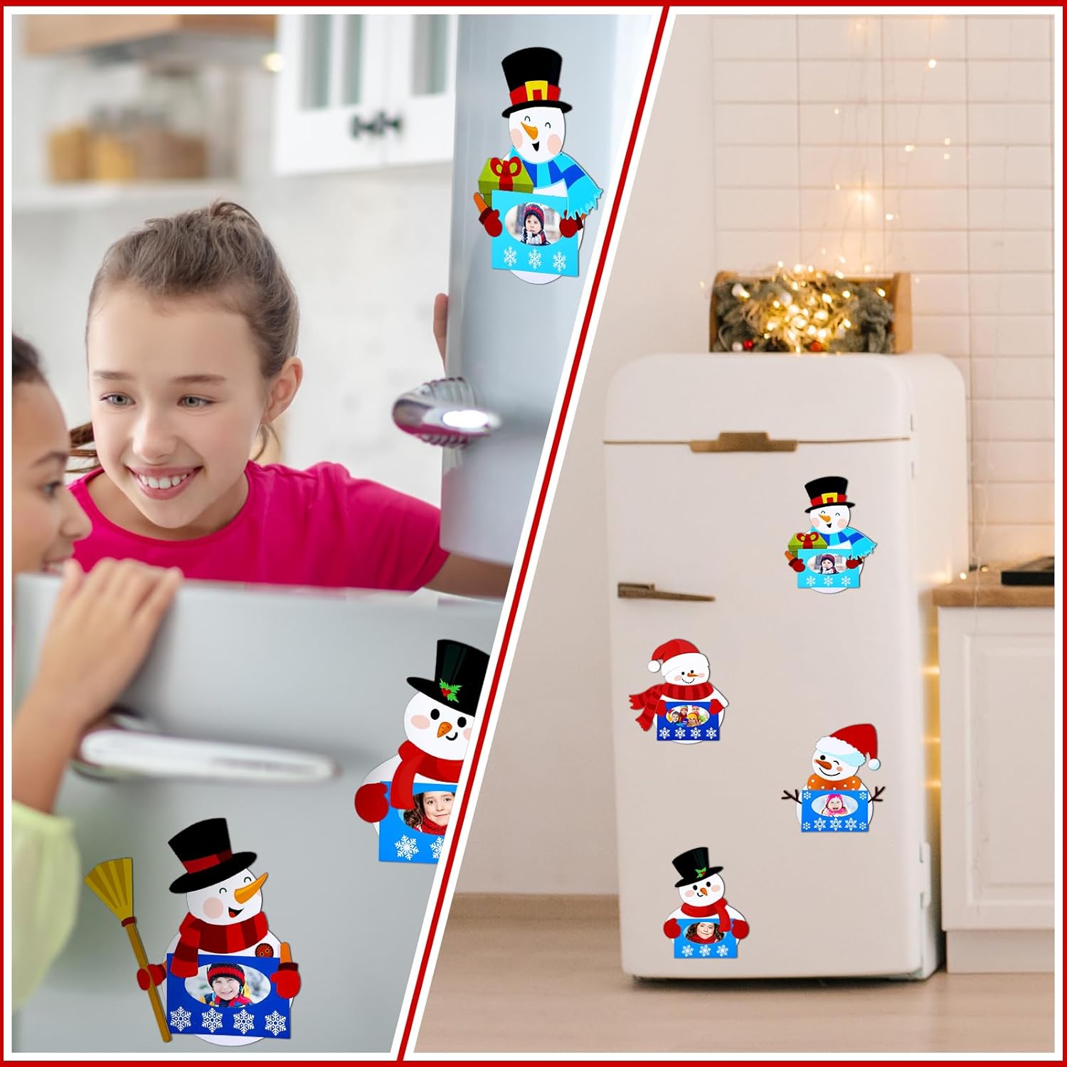 Features: Magnetic Adhesion Design: The Xmas snowman DIY crafts come with adhesive magnets, can be conveniently placed on refrigerators or other metallic surfaces, which can showcase your photos well. The stunning color contrast of these winter photo decorations will undoubtedly render your guests impressed. How to DIY: You can create your own snowman photo frame crafts by attaching adhesive dots. Then put your sweet and warm winter photo into the photo frame. Finally paste soft magnets on the back to display on the refrigerator or any other magnetic surface. Specifications: Material: cardboard. Magnetic material Color: multicolor Size: various size Package includes: 30 Sets snowman craft kits 30 x Soft magnets 4 Sheets adhesive dots Notes: Manual measurement, please allow slight errors on size. The color may exist a slight difference due to different screen displays