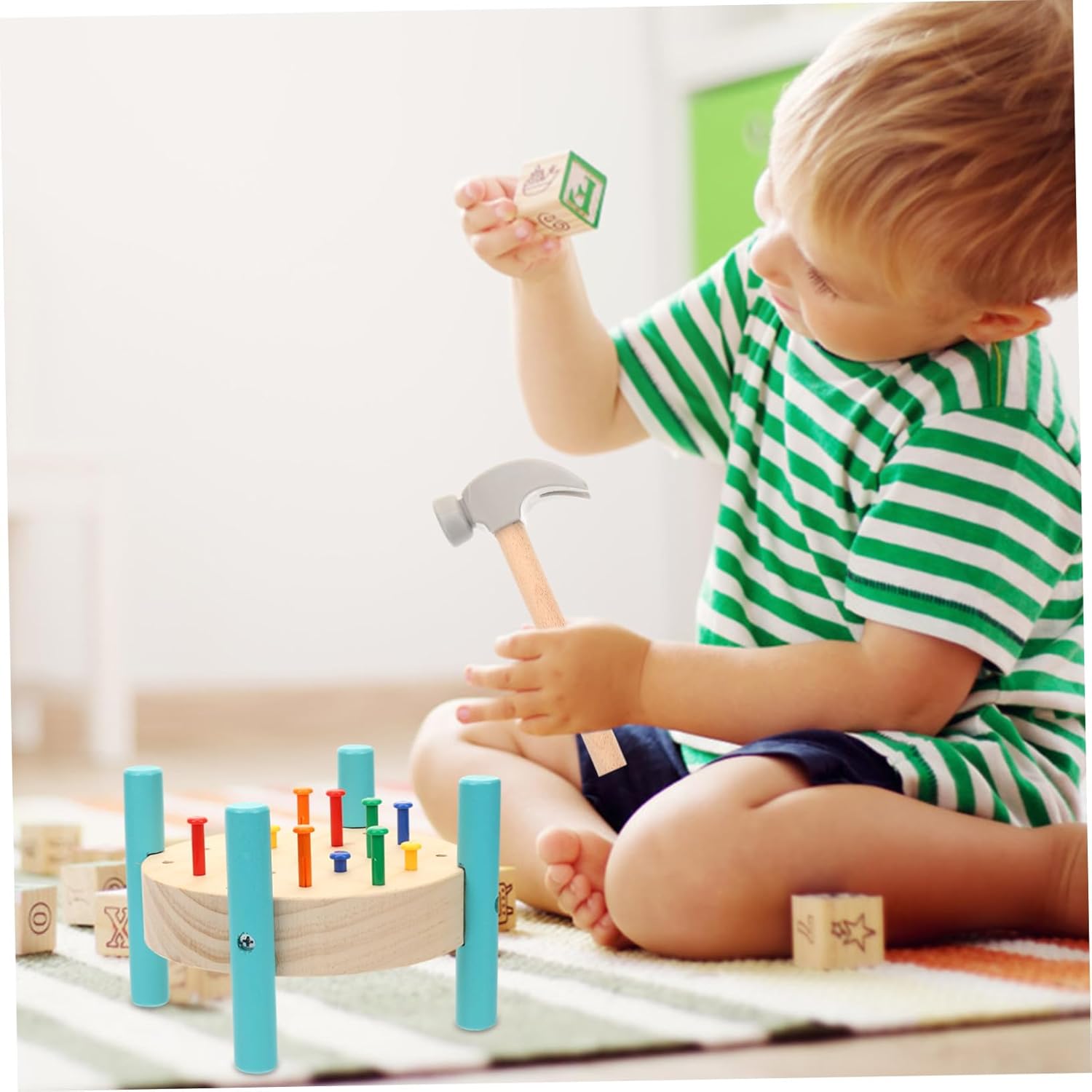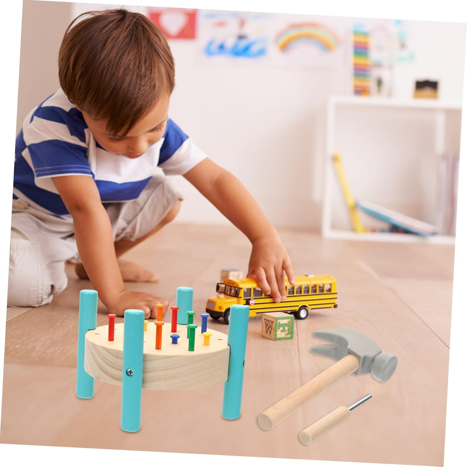 Package list: 1 set x wooden nail table hammer. Features - Size: 15.50 x 7.40 x 2.70 cm/6.09 x 2.91 x 1.06 in hammer hammering. - Colour: multi-coloured hammer toy for - Material: wooden hammer toy for toddlers. - Size: 19.00 x 19.00 x 12.00 cm/7.47 x 7.47 x 4.72 in hammers. - Product info: teaching tools for nail tables. - Easy to play, fun game: nail hammer- on the wooden workbench, brings children joy to this hammer. - Bright colour design easily attracts attention and lets you learn colours, creating learning with a hammer toy. - Educational and fun, can help train children's hand-eye coordination and thinking when hammering toys. - Nail and batting table hammer toy is made of wood and finely polished, making it a safe, interactive hammer. - Smooth surface, reliable and practical, you don't have to worry about hurting your hands during the hammering game. Product Description Hammer and strike toy. Promotes hand-eye coordination and active thinking. Hammer Toy This is a wooden nail and impact bench hammer toy, bright color, fine workmanship. Hammer toy for . Safe and odourless, fun and interesting for players, the right size is suitable for toddlers.