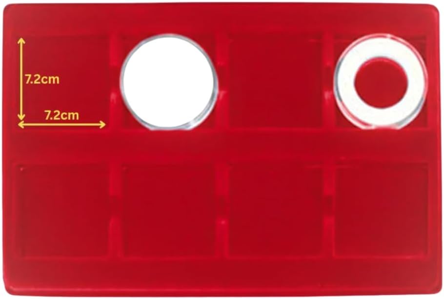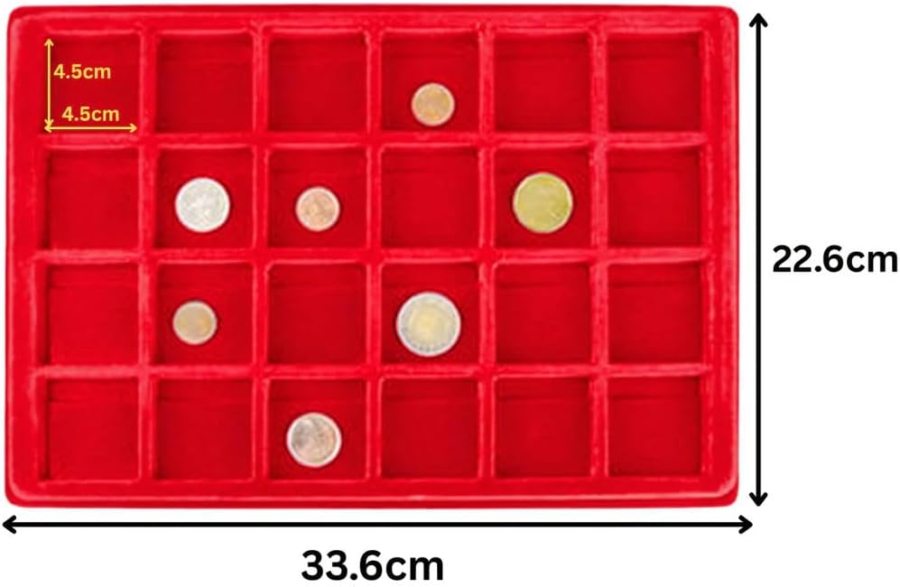 Protect and present your valuable coin collection with the PCCB MINGT Classic Coin Display Tray Series — the trusted choice among collectors and exhibitors. Each tray is made with a rigid, durable frame and lined with soft velvet, ensuring your coins stay safe from scratches and movement while maintaining a premium presentation. The tray’s external dimension is 336 mm × 226 mm, designed to fit neatly into most cabinets and display cases. Choose between: 8 Grids Tray: Each grid measures 72 mm × 72 mm, ideal for larger coins, medals, or medium round capsules.24 Grids Tray: Each grid measures 45 mm × 45 mm, perfect for smaller or standard-size coin capsules. Both sizes are stackable for easy expansion as your collection grows. Available in Blue or Red velvet finishes, these trays combine durability, elegance, and functionality — perfect for both new and experienced collectors. Whether used at home, in coin fairs, or exhibitions, the PCCB MINGT Classic Series helps you store and display your coins with style and confidence. Important Notes for Customers:The price is for one display tray only.Coins and coin capsules shown in the images are for display purposes only and not included.Please measure your collection carefully and confirm the correct grid size before purchasing.