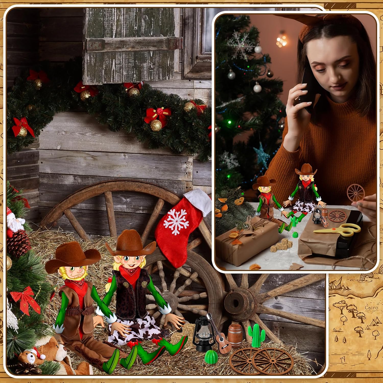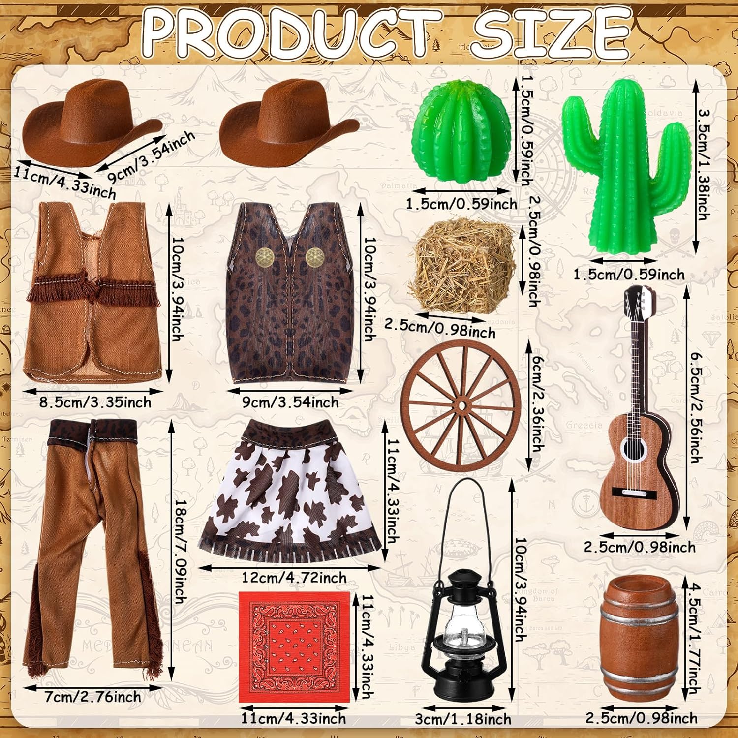 | Included Components | 1 Set of women's cowboy costumes ,1 Set of men's cowboy costumes ,1 x Wooden mini wine barrel, 1 mini lantern, 5 mini straw, 2 simulated cactus, 1 mini guitar, 2 car wheels |