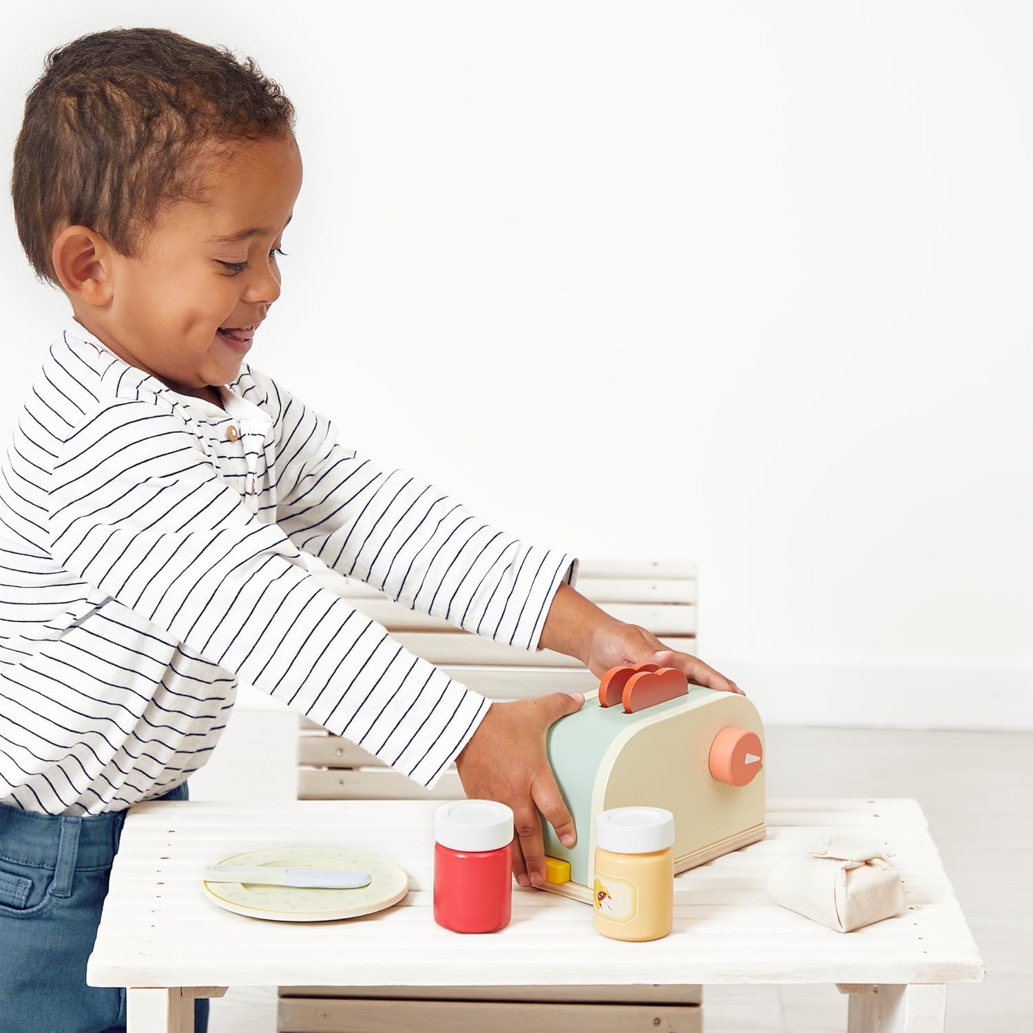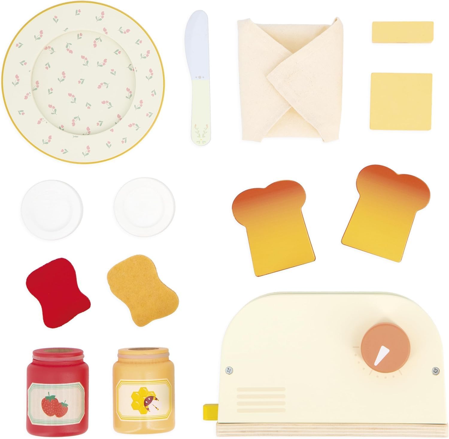 What a delicious smell of toast to start the day smoothly! This breakfast set offers everything you need to mimic a true gourmet morning: ready-to-toast slices of bread bread, butter spreads, sweet strawberry jam, and even honey for the hobbyist. Place the toast in the toaster, adjust the temperature using the rotary knob and press: hop, the toasts jump like in a real kitchen! An elegant plate and butter knife complete this perfect set. This wooden imitation toy, designed for children from 3 years old, stimulates their imagination and fine motor skills while allowing them to learn about everyday gestures. A great way to play while learning to reproduce the rituals of the big ones!