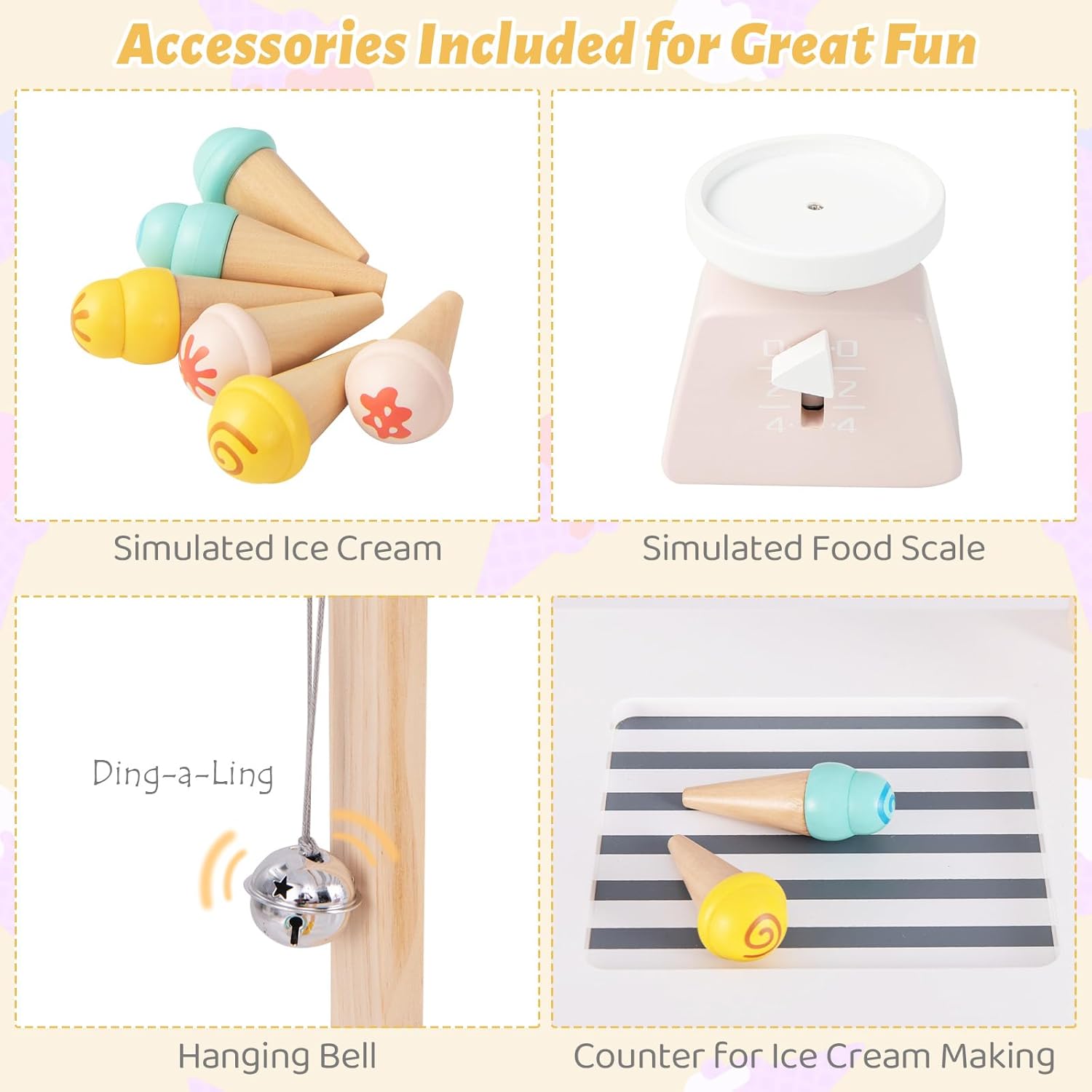 | Included Components | 1 x Ice Cream Cart, 8 x Accessories, 1 x Instruction |
