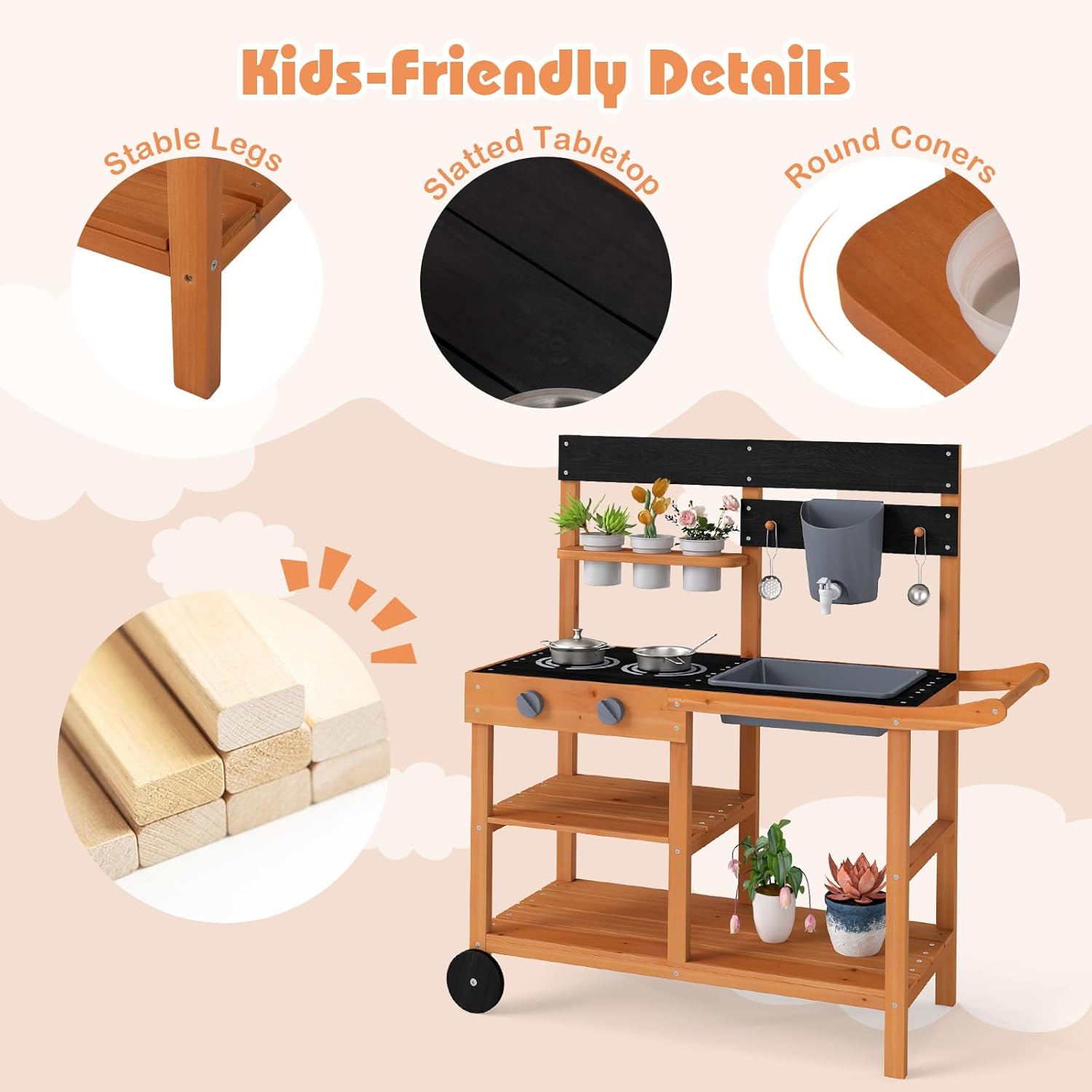 Why do you choose INFANS Kid Kitchen Playset?INFANS mud kitchen is super versatile and includes realistic faucets, detachable sinks, stoves, cooking accessories, planters and sprinklers, and oversized storage space. Children can play imaginative games while learning about food preparation and kitchen chores. In addition, this children's outdoor mud kitchen comes with two wheels and handrails for easy movement. With interactive features like transparent cups that double as paint cups or plant pots, realistic kitchen accessories, and a chalkboard surface for drawing and writing, this set offers a dynamic learning experience that encourages exploration, experimentation, and hands-on discovery. Perfect for social play, the kitchen set accommodates two children, promoting teamwork, communication, and cooperative play as they create, learn, and have fun together. Let your child's creativity soar with the endless possibilities of the acrylic graffiti kitchen set.Features:US. CPSIA & ASTM approvedCombines enjoyment with practicalityDevelop essential life skills through playDurable and long-lasting constructionTeach food and general skills to childrenPromotes cooperation and communicationIdeal present for birthdays and special occasionsPromotes cooperation and communicationSpecifications:Suitable Age: 3+ years oldOverall Dimension: 34" x 14" x 36" (L x W x H)Material: MDF +PP+ Stainless SteelPackage Includes:1 x Kitchen Playset1 X Multiple Kitchen Accessories1 x Instruction