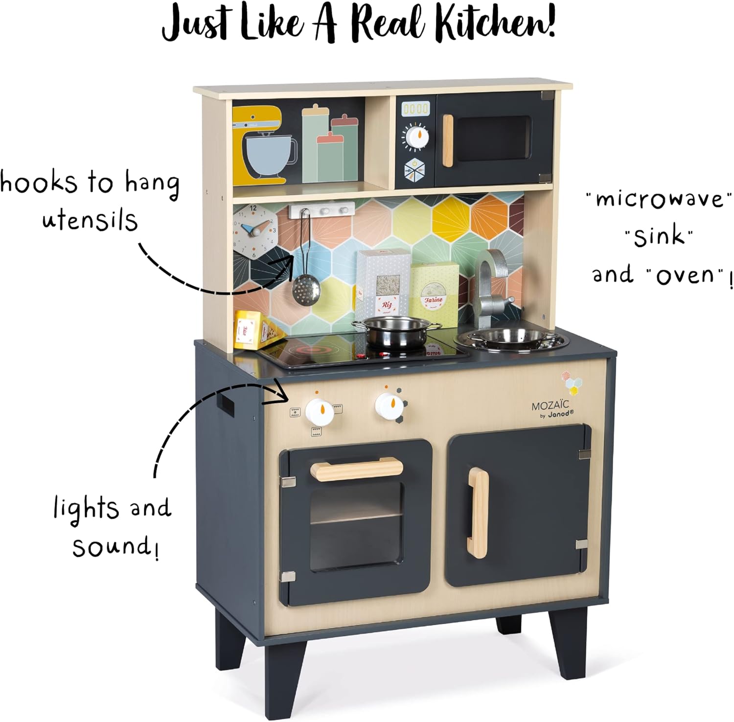 | Item Type Name | Janod - Mozaïc Big Cooker - Play kitchen for children - Children's kitchen with sound and light - Wooden kitchen with 3 accessories + 3 food boxes - From 3 years, J06609 |
