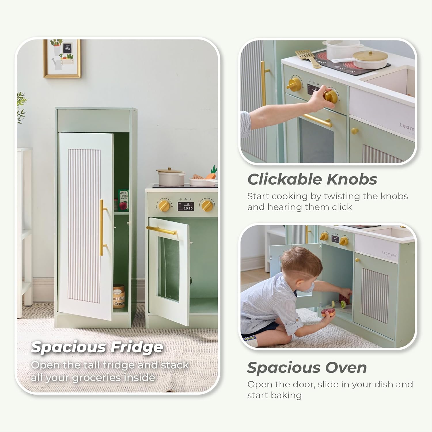 Let your little chef take the lead with this modern wooden play kitchen—designed not just for style, but for meaningful, hands-on play. This green kids kitchen playset sparks imagination, builds confidence, and supports key developmental skills, all while looking beautiful in your home. From whipping up pretend meals to organizing groceries in the fridge, this toddler kitchen set gives kids the space to role-play real-life routines in their own creative way. It encourages independent play, storytelling, and social interaction as they “cook,” clean, and serve—just like grown-ups do. The two-piece layout—a stovetop/sink unit and separate refrigerator—can be arranged in any space, giving children the freedom to design their own kitchen setup. Hanging hooks and storage areas help reinforce responsibility and tidiness in a way that feels fun and rewarding. With 12 accessories included (like a pot, pan, utensils, veggies, and pretend treats), kids have everything they need to dive into hours of open-ended play. No batteries, screens, or extra purchases—just pure, imaginative fun. Whether you're looking for a pretend kitchen for kids, a kitchen playset for toddlers, or a toy kitchen set that grows with your child, this thoughtfully designed set delivers lasting value. It's the perfect gift for birthdays, holidays, or just because they love to play house.