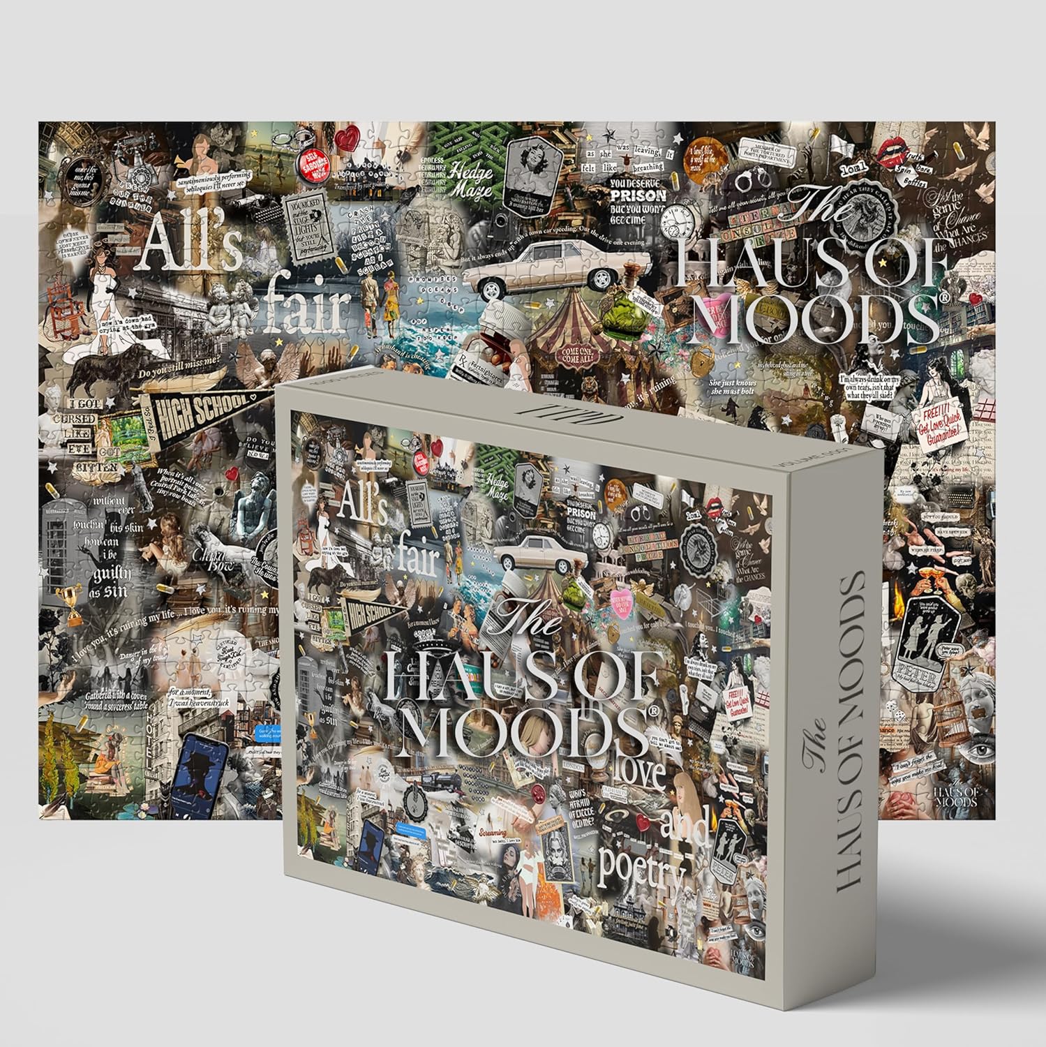 For the introspective, the dreamers, and the romantics—introducing the puzzle that tells a story. The Lyrics & Easter Eggs Puzzles by Haus of Moods is a collage-style masterpiece designed to evoke nostalgia, poetic storytelling, and woodland-core vibes. Each section is filled with moody details, hidden symbols, and subtle nods to beloved lyrics and emotions. Available in: 500 or 1000 Pieces Design: Collage-style patchwork with layered storytelling Dimensions: 1000pc – 30”x20” Made From: Recycled chipboard, matte linen finish, non-toxic inks Made in the USA by Portland Puzzle Co. Why Puzzlers Love It: Emotionally Resonant: Each piece carries a mood, memory, or lyric reference Unique Cut: Random-cut pieces ensure a fresh, satisfying challenge Display-Ready: Frame your finished puzzle for instant wall art Gift-Ready: Shipped in a custom box—perfect for fans, friends, and cozy nights in Because it’s more than just a puzzle—it’s a moment of connection, reflection, and story.