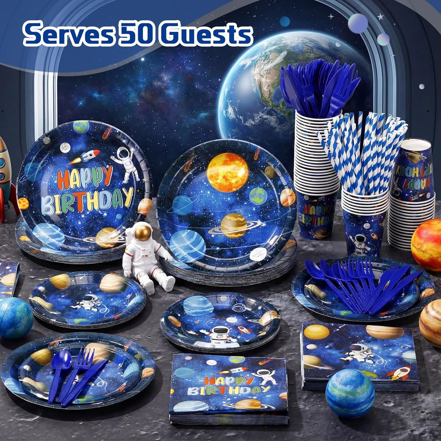 Features: Blast off into fun with a space-themed party: Turn your birthday into an intergalactic adventure with this vibrant space themed tableware set. Featuring planets, astronauts, and rockets, this set is designed to capture the imagination of young explorers. The bold colors and exciting space illustrations make it the nice choice for any space loving people. Whether it's a birthday party, a science event, or a themed celebration, this set will make your special day out of this world! A stellar party set for out-of-this-world celebrations: Create an unforgettable experience with this space-themed party set, designed to spark joy and inspire curiosity. Featuring stunning space imagery, this set includes everything you need for a fun and functional celebration — plates, cups, napkins, and straws — all in one complete package. Ideal for space-themed birthday parties, educational events, or family gatherings, this set adds a touch of cosmic wonder to any occasion. Let your little astronauts enjoy their party in true space style! Specifications: Main material: paper Size: 7 inch and 9 inch (plate) Package includes: 100 x Paper plates 100 x Napkins 50 x Coffee cups 50 x Knives 50 x Forks 50 x Spoons 50 x Straws Notes: Manual measurement, please allow slight errors on size. The color may exist a slight difference due to different screen displays