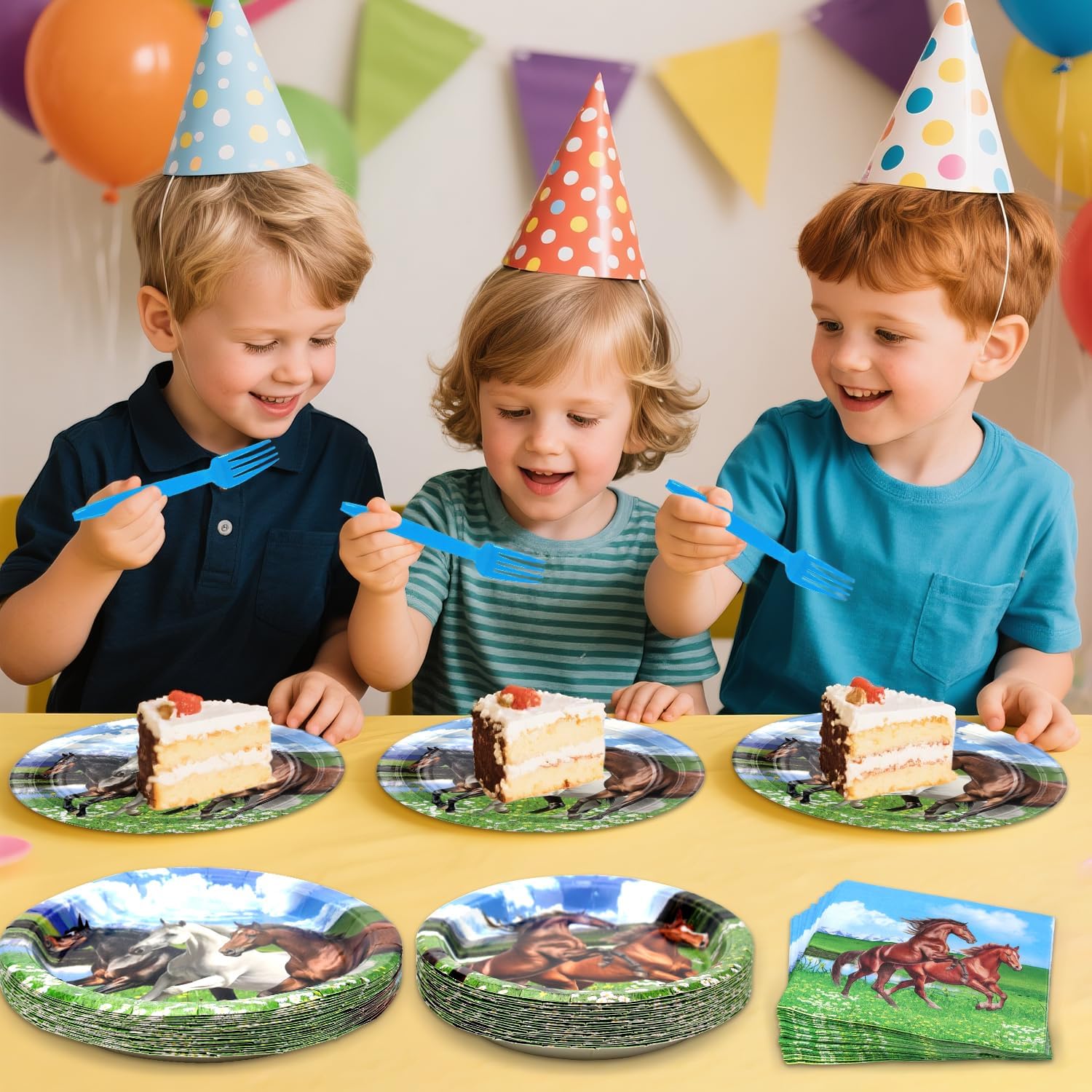 Horse Party Decoration: Cowboy Horse birthday tableware decorations are painted with lifelike patterns of wild horses, blue sky, white clouds, snow mountain, and more. If you add these horse party plates to your party, you will feel the scenery of nature, creating a natural atmosphere for your party.